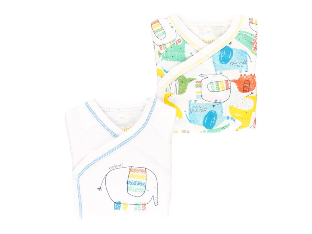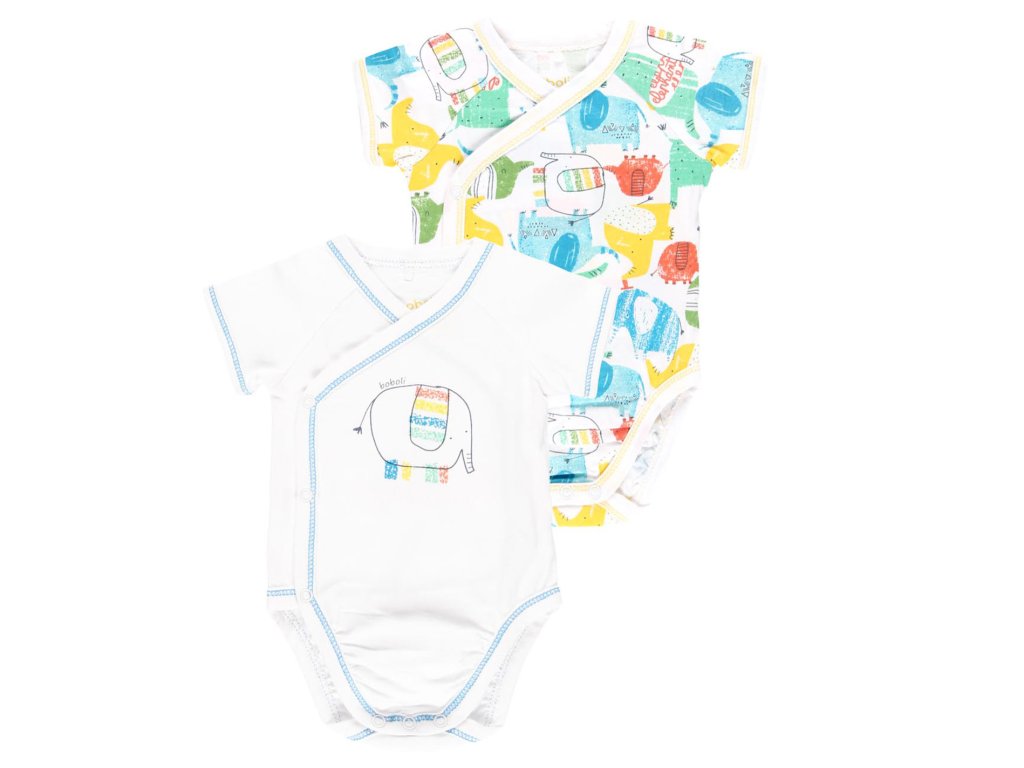 Dvě zavinovací body s krátkým rukávem a veselým potiskem barevných slonů z jemné 100% bavlny. Baleno v papírové krabičce. OEKO-TEX certifikát.