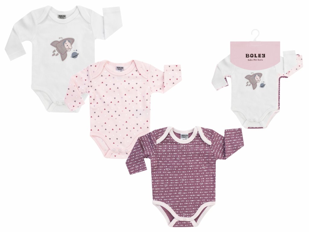 Tři bodýčka s dlouhým rukávem z jemné bílé a růžové 100% bavlny, s roztomilým a kvalitním potiskem medvídka v raketě, celoplošnými tečkami, nebo trojůhelníčky. Německá kvalita. EKO-TEX Standard 100 certifikát a VFI social fair.