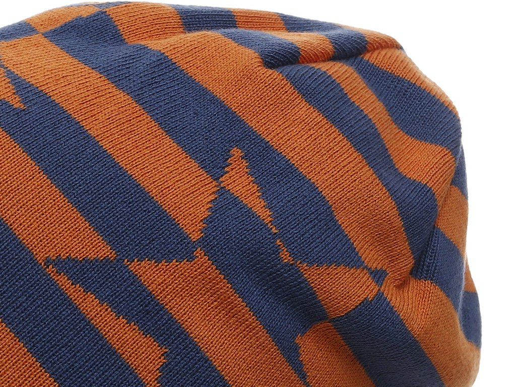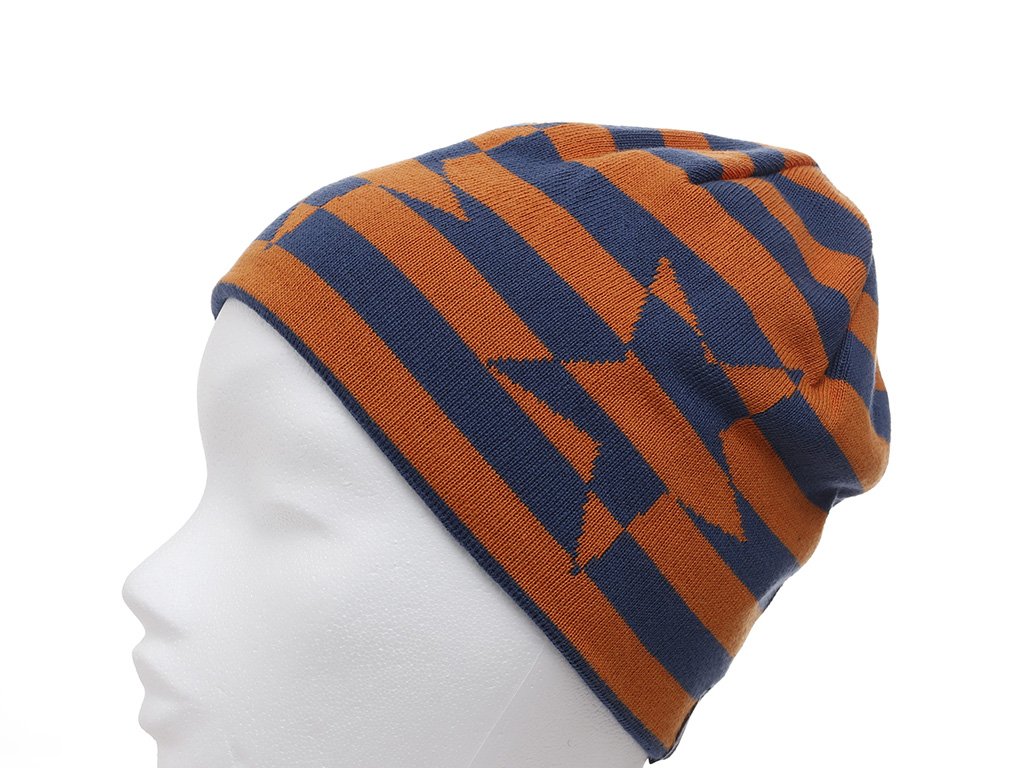 Oboustranná dětská zimní čepice tvaru beanie z jemné dvouvrstvé pleteniny ze 100% bavlny. Jedna strana má skořicově oranžové a tmavě modré pruhy a velkou hvězdu. Druhá strana je tmavě modrá (půlnoční modř). Německá kvalita.