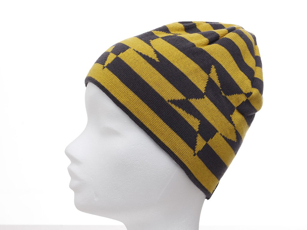 Oboustranná dětská zimní čepice tvaru beanie z jemné pleteniny. Jedna strana má žluto-šedé pruhy a velkou hvězdu. Druhá strana je teple šedá. 100% bavlna. Německá kvalita