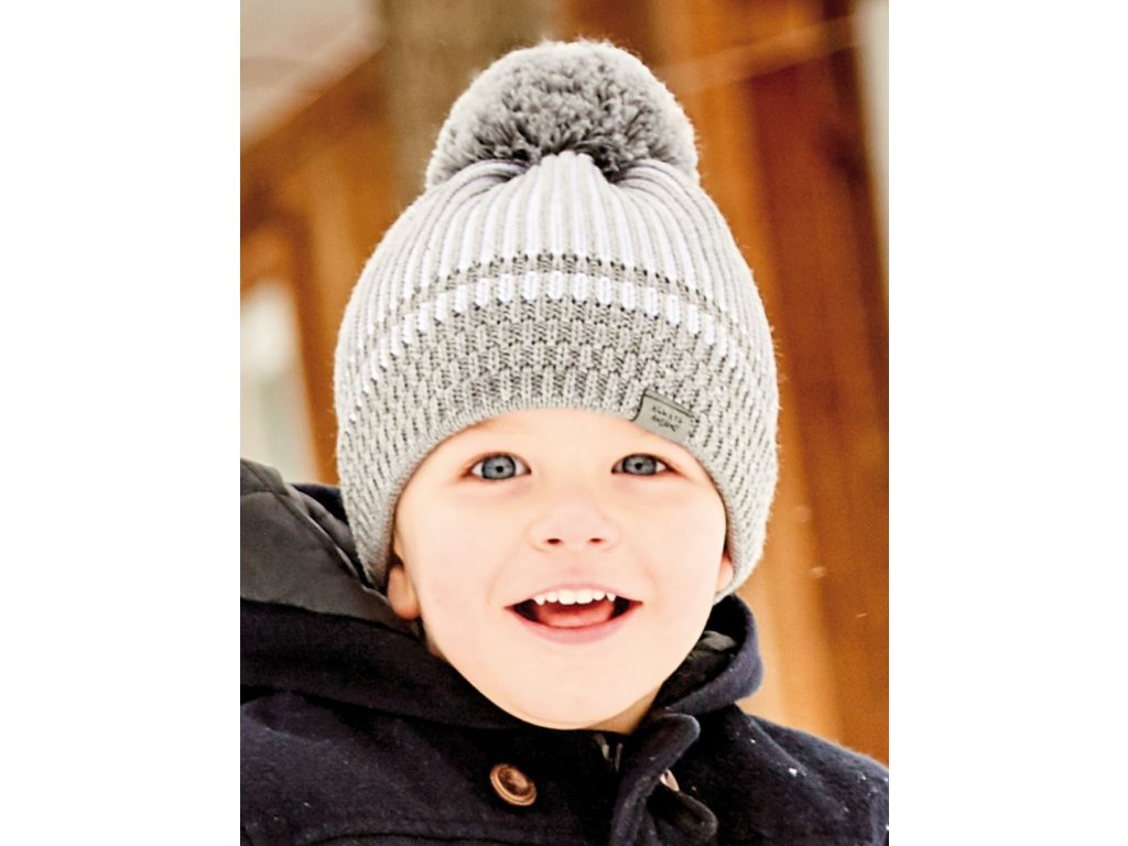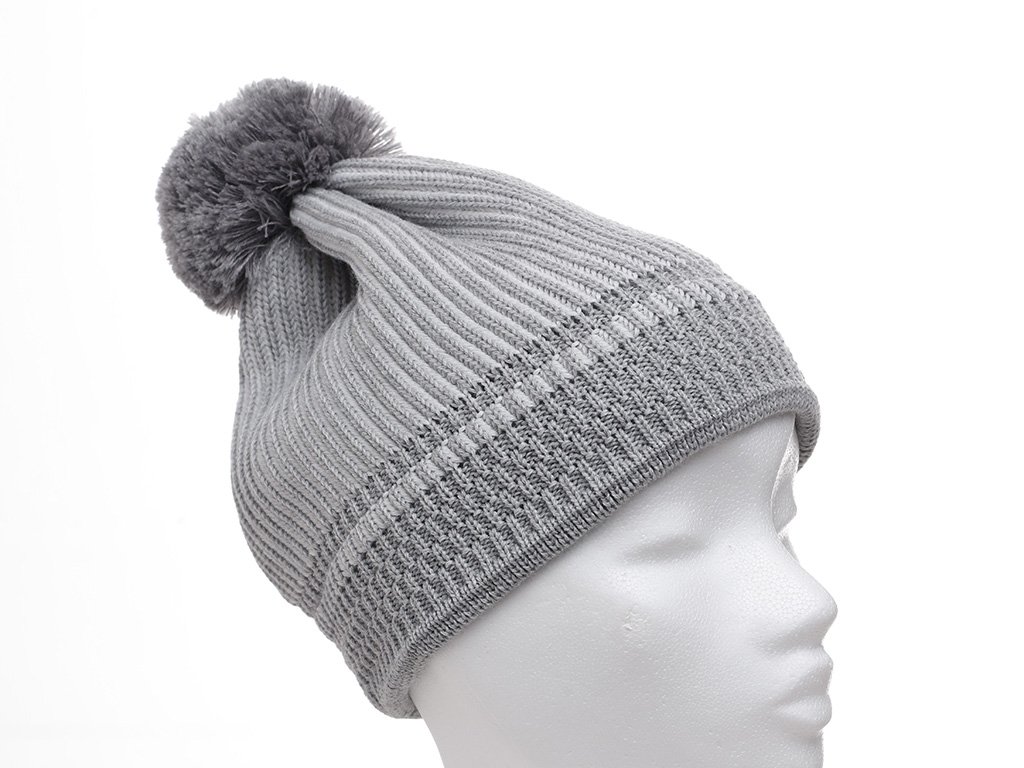 Dětská zimní pletená čepice s bambulí, s jemným žebrovým vzorem, vlněná s jemně pletenou podšívkou ze 100% bavlny. Světle šedá.