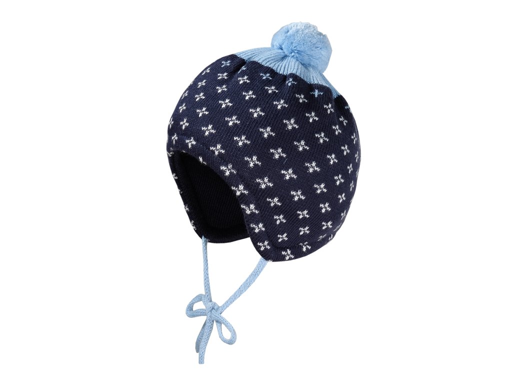 Modrý kulíšek s bambulkou pro miminko. Chlapecká zimní čepice z jemné a hladké pleteniny s podšívkou, 100% bavlna. Německá kvalita.