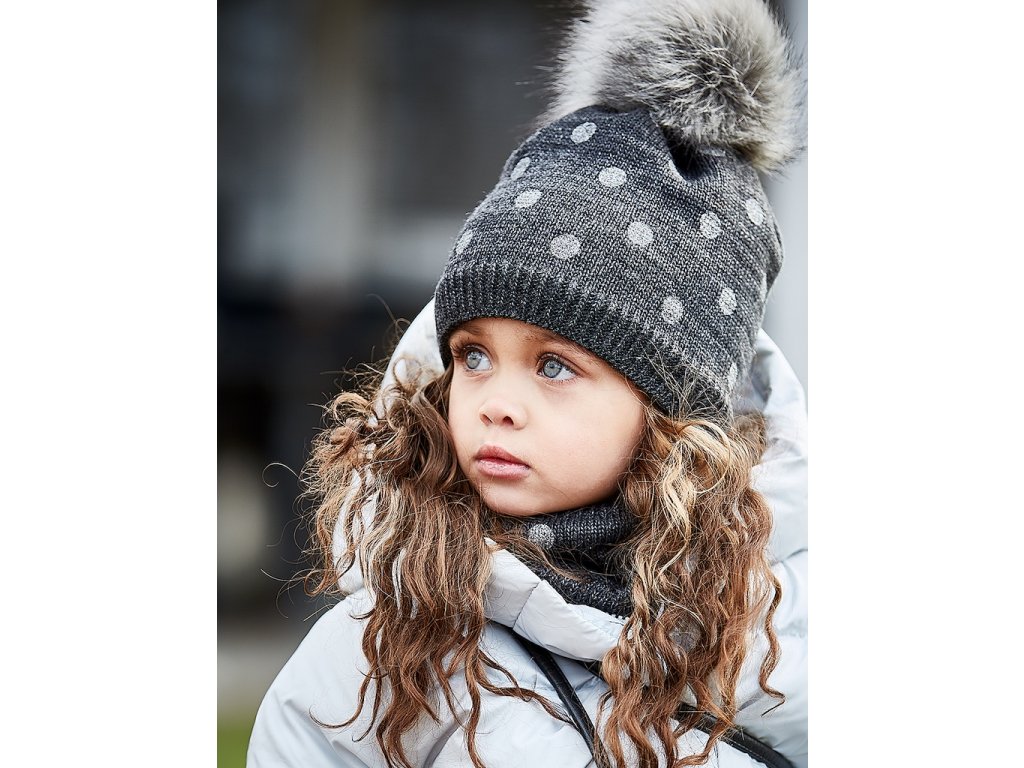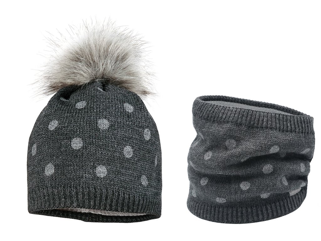 Pletený set pro holky tmavě šedé antracit barvy se třpytivými puntíky. Dívčí čepice s chlupatou bambulí + nákrčník, s fleecovou podšívkou. Tmavý kulíšek s bambulkou a tunel z příjemného, pružného a hřejivého materiálu. Německá kvalita.