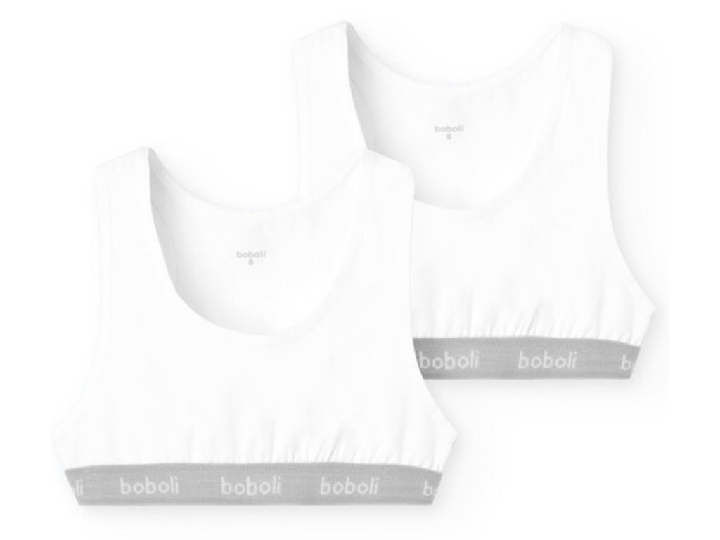 Dvě bavlněné dívčí podprsenky z pružné bavlny a s gumou, velmi oblíbený a pohodlný tvar. Bavlna 95% a elastan. Baleno v papírové krabičce Boboli.