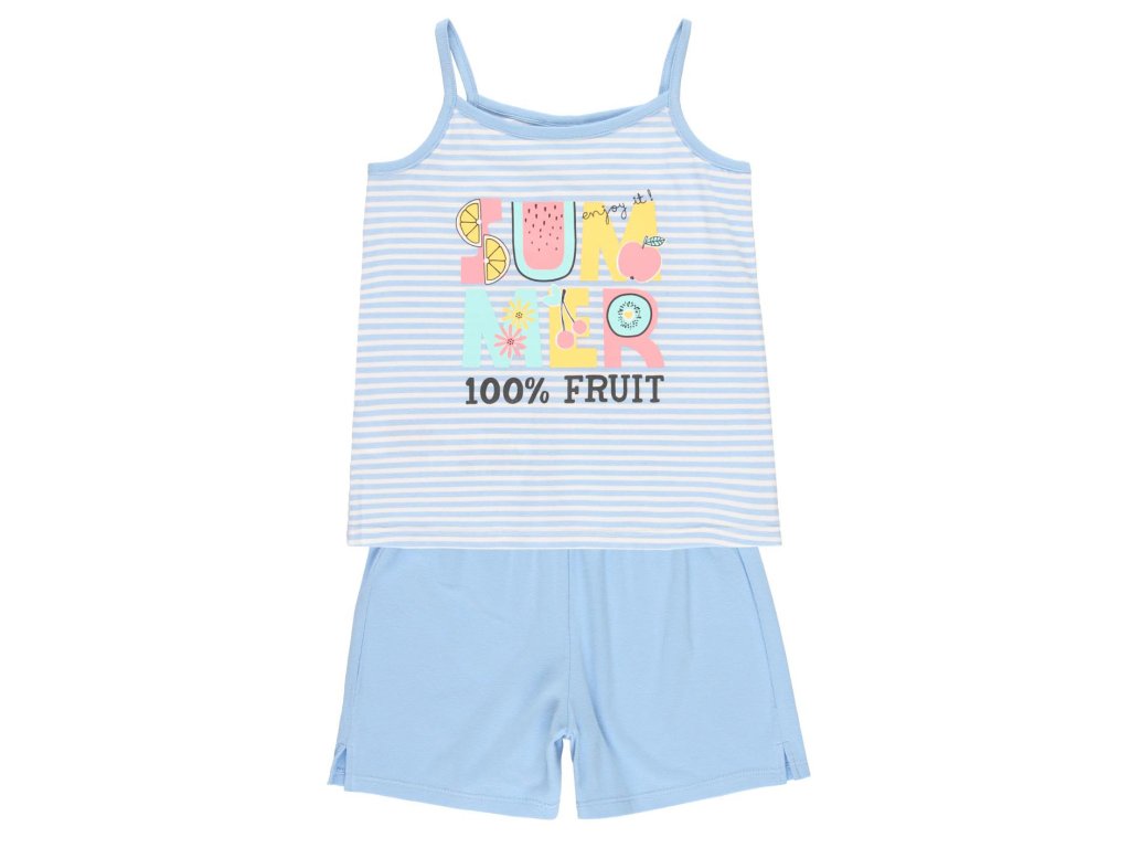 Balvněné pyžamo pro holku, s tílkem a šortkami, modrobíle pruhované s barevným potiskem plným ovoce a léta. Letní pyžamo pro holku.
