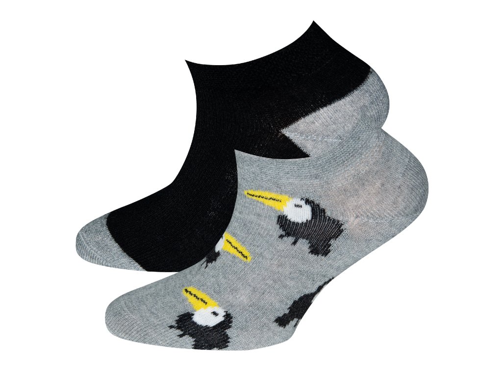 Dva páry nízkých dětských ponožek se širokým lemem, který netlačí. Příjemný materiál s vysokým podílem bavlny. Každý pár v jiné barevné variantě (černá a šedá bez obrázku, nebo opakovaný potisk: tukan černobílý se žlutým zobákem na světle šedé). EKO-TEX standard 100 certifikát.