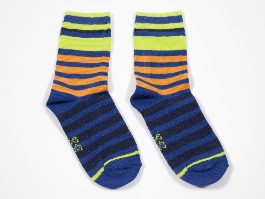 Dětské pruhované ponožky se širokým lemem. Ponožky, které netlačí a dobře sedí. Příjemný materiál s vysokým podílem bavlny. EKO-TEX standard 100 certifikát. Barevná kombinace tmavě modré, královsky modré, svítivě zelené a oranžové.