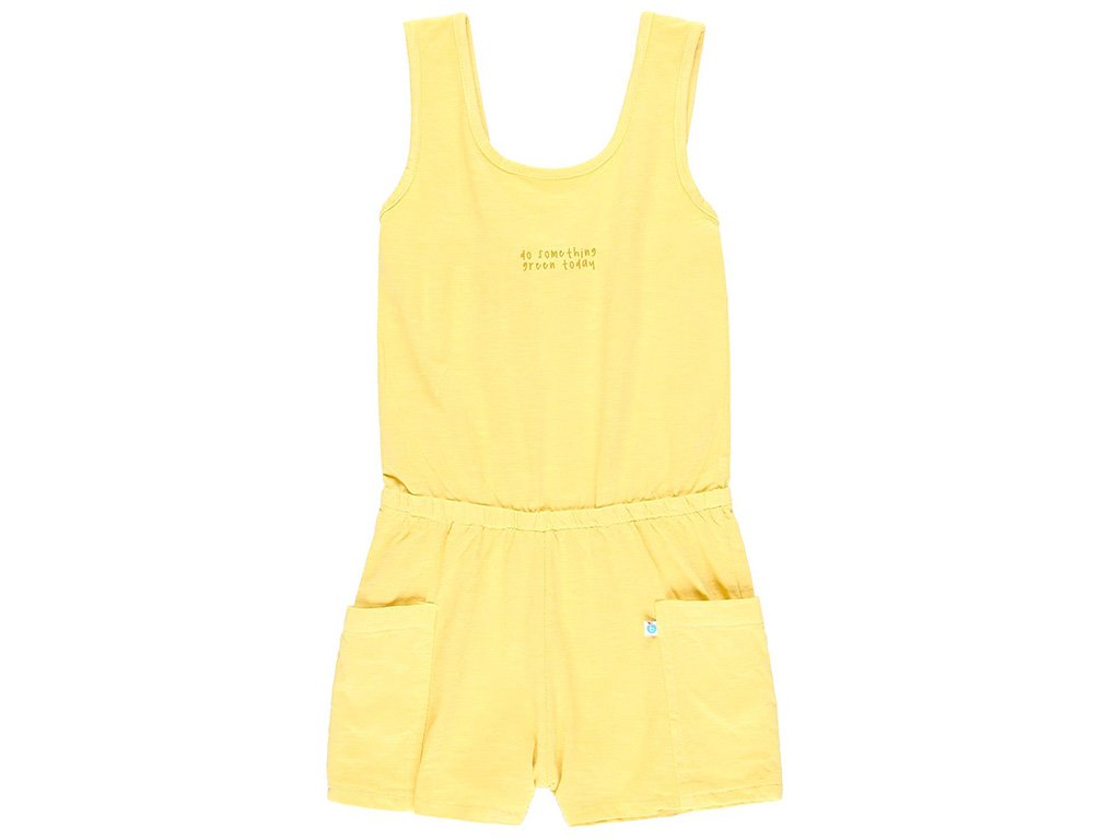 Dívčí letní overal (tílko a šortky) pro holku ze 100% organické bavlny v grepově žluté barvě. Drobný nápis s ekologickou výzvou "Do something green today" (udělej dnes něco ekologického). Velmi příjemný materiál. Kolekce Organic od Boboli.