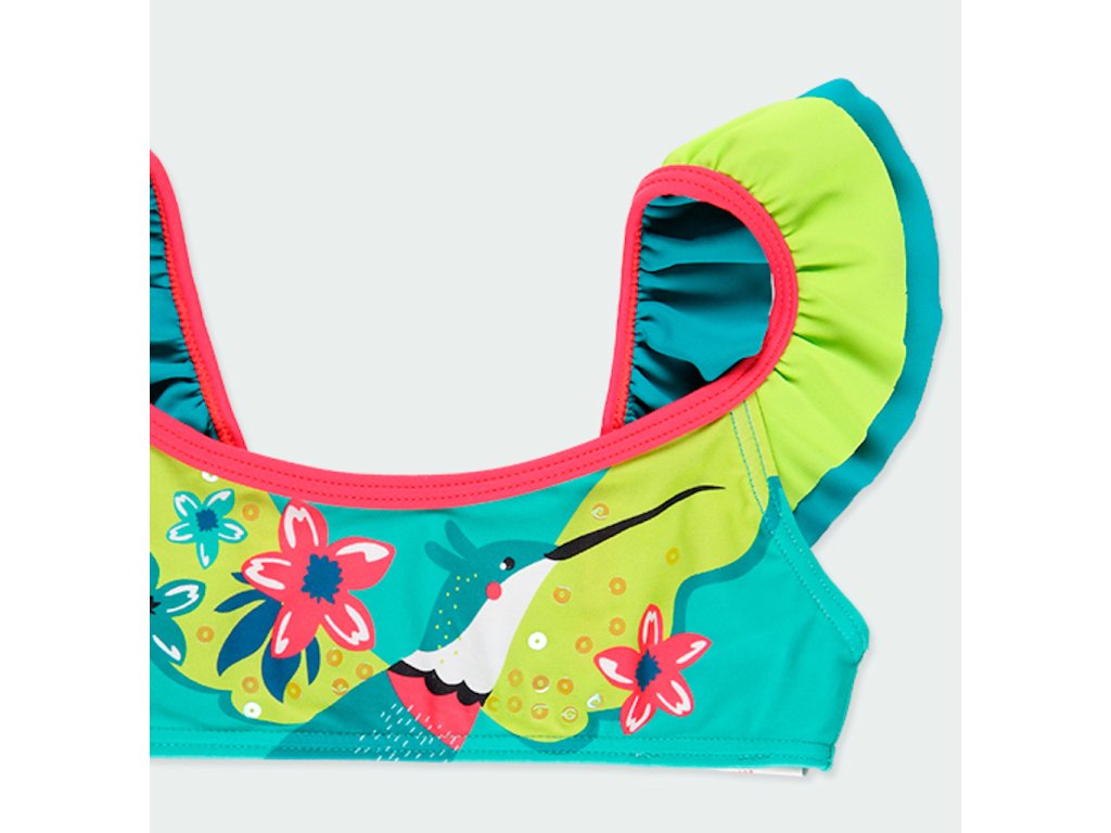 Dvoudílné dívčí plavky pro holčičku 4-6 let. Barevné bikiny s volánky, flitry, květy a kolibříkem. Velmi příjemný rychleschnoucí materiál (lycra Extra lifeTM vlákno). S praktickou taštičkou na mokré plavky. OEKO-TEX certifikát. Amfori udržitelná móda od Boboli.
