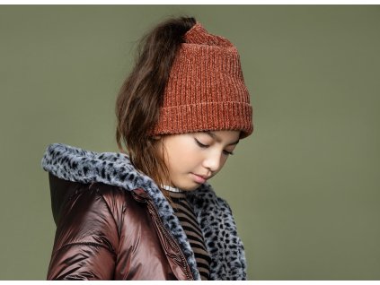 Pletená čepice (beanie) se šálou v setu, dívčí doplněk pro chladné počasí. Hrubá pletenina kaštanově hnědé barvy s fleecovou čelenkou v podšívce. Měkounká a pružná čepice pro holku. Holandská značka NoNo.