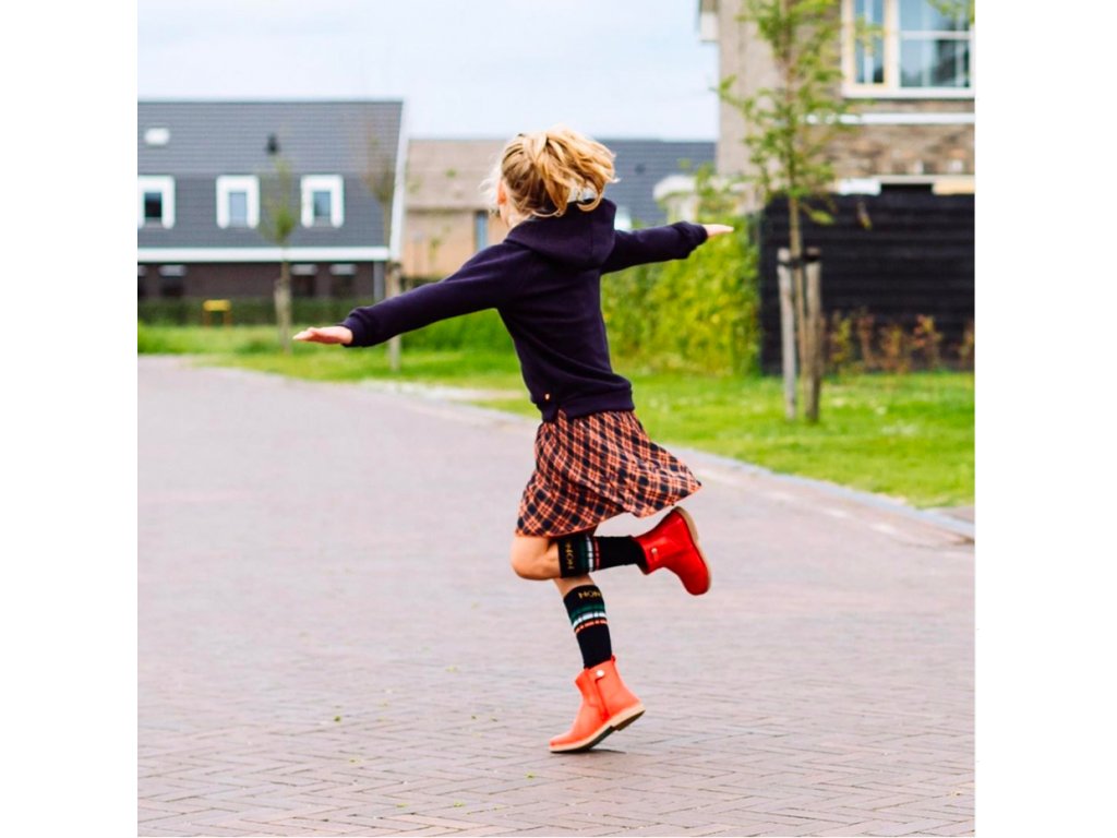 Tmavě modré podkolenky pro holku s barevnými proužky dodají sportovní šmrnc. Velmi příjemný materiál. Do setu k šatům od Holandské značky NONO.
