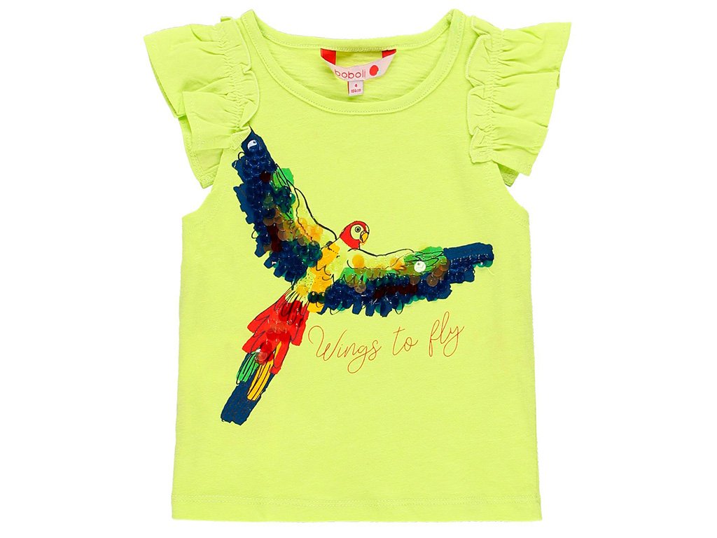 Limetkově zelené dívčí tričko ze 100% bavlny, s elegantními rukávky z volánků a kombinovaným pestrobarevným potiskem papouška s roztaženými křídly, zdobenými flitry. Drobný nápis Wing to fly (křídla na letání). Příjemné a hravé tričko.