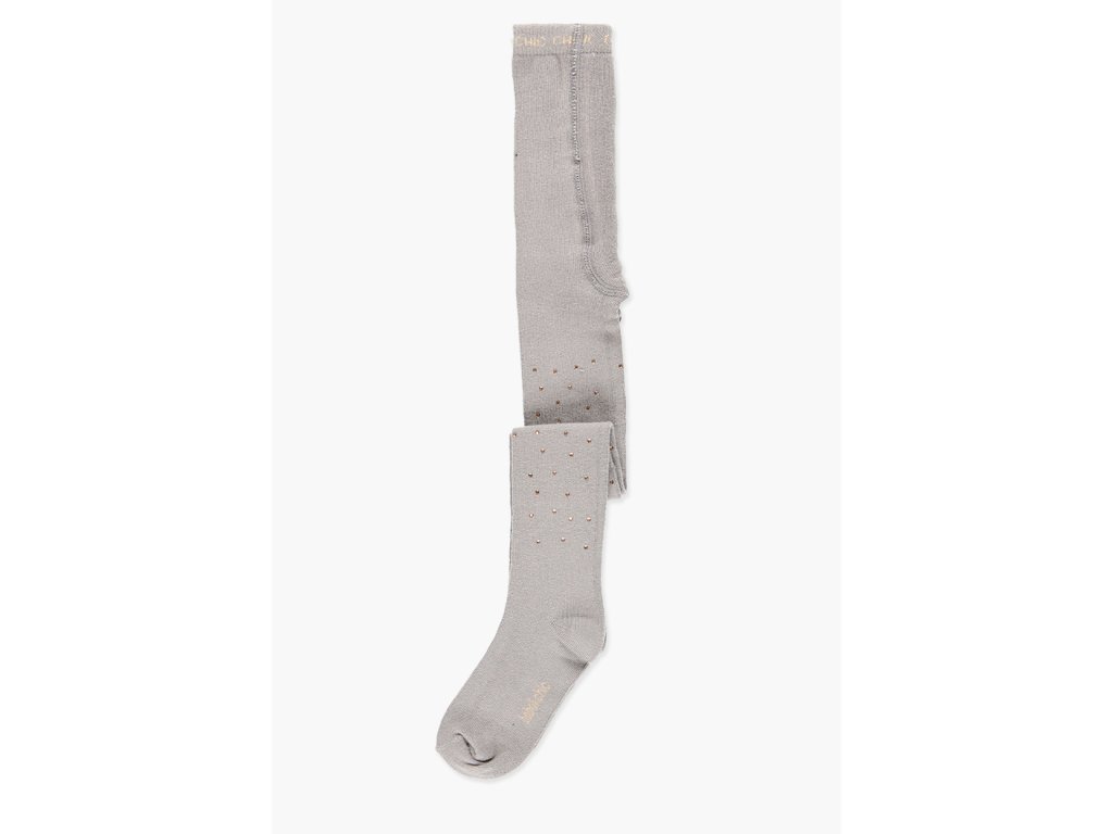 Dívčí bavlněné punčocháče světle šedé, teplé barvy, řídce potištěné zlatými kamínky v oblasti nohavic (sedací část a chodidla do výše nad kotníky jsou nepotištěné). Pružné a velmi příjemné na dotek. Dekorativní doplněk k šatům.