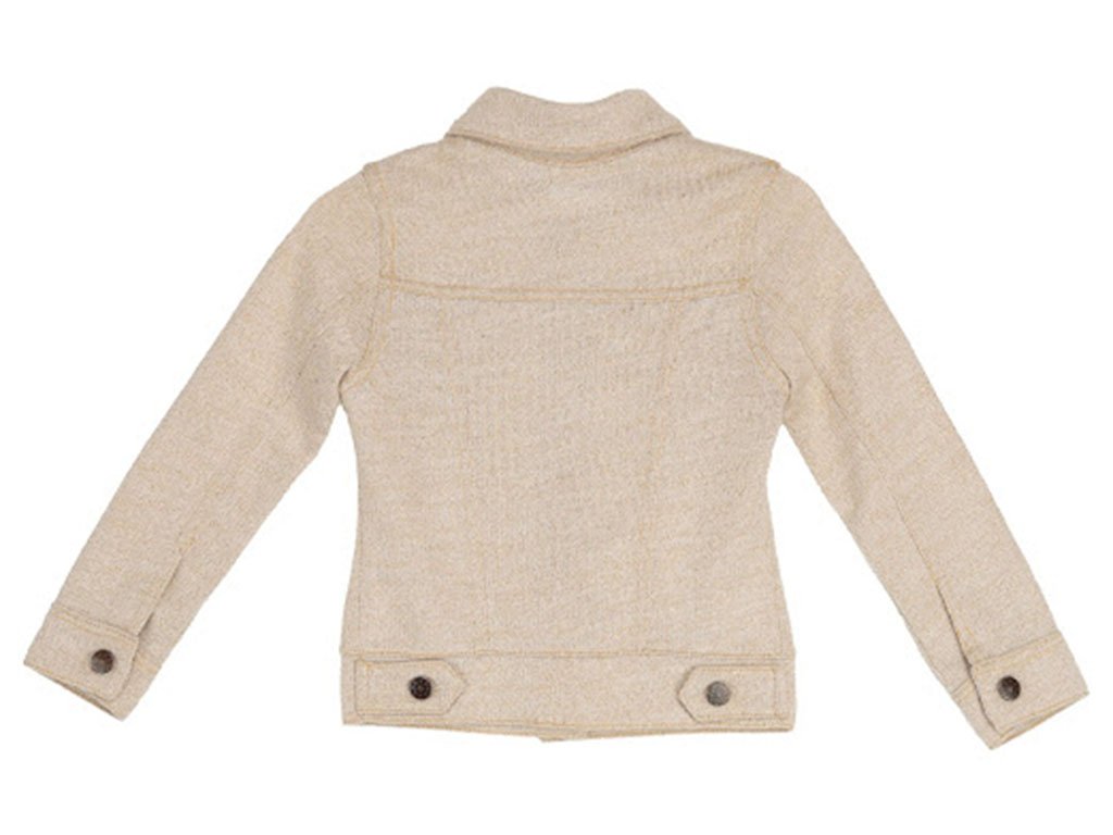 Béžová bunda ze strečové pleteniny se zlatou nití, typu džínska s klasickým rozepínáním na kovové cvočky, dvě náprsní kapsy, manžety, a s límečkem. Ze španělské návrhářské dílny Villalobos + Nieves Alvarez (N+V).