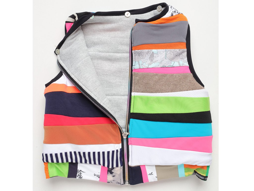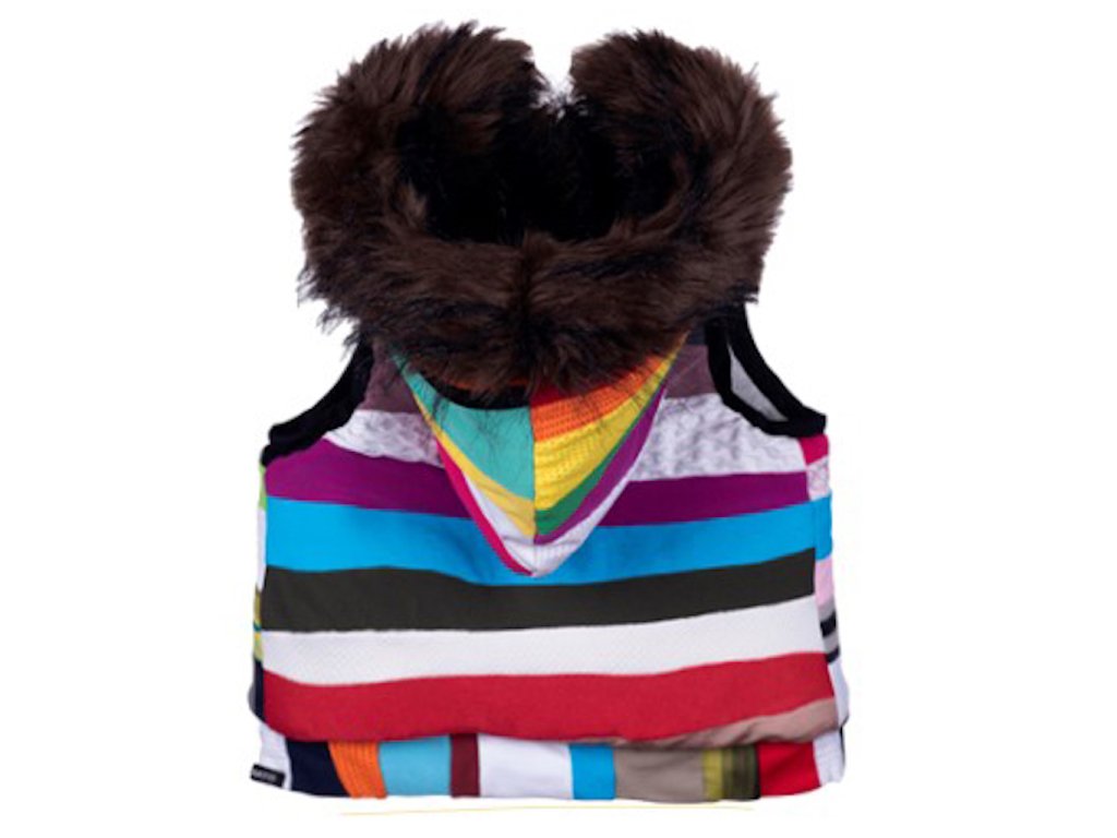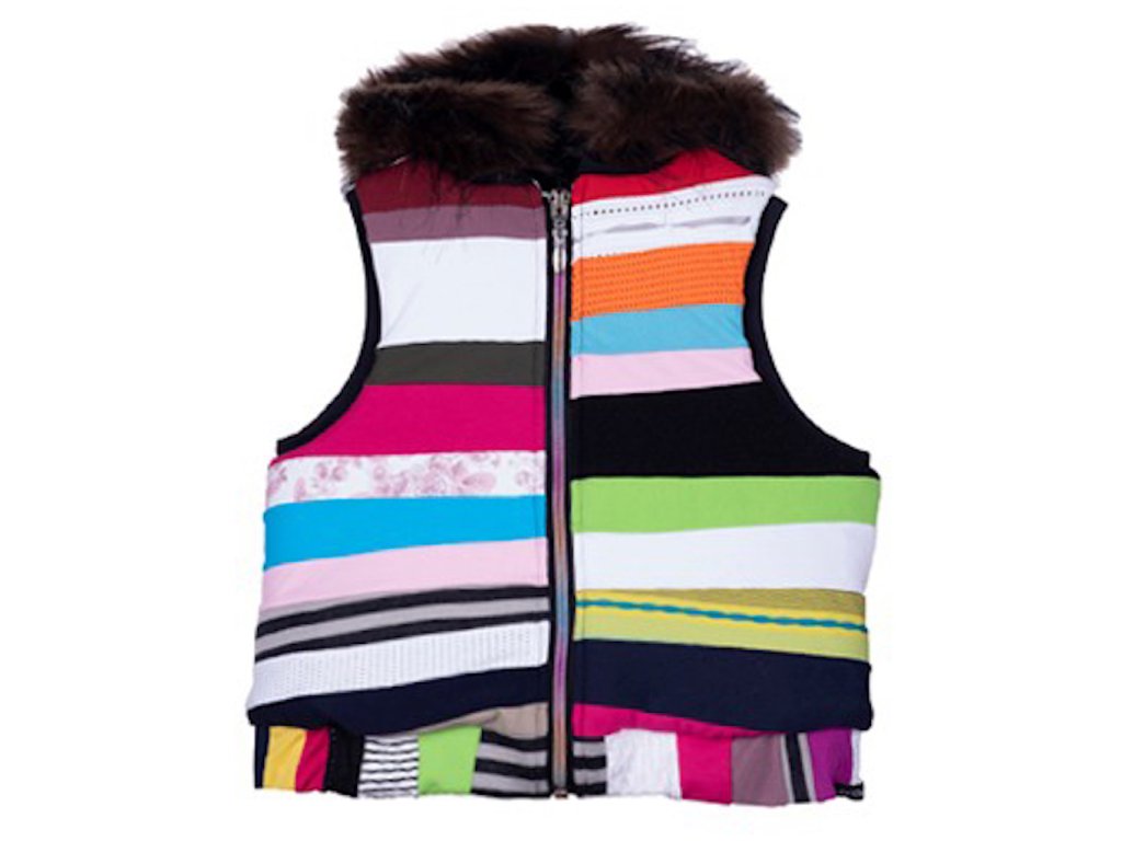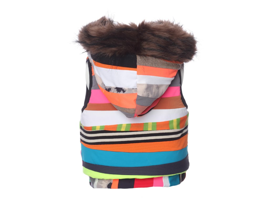 Maximálně designová zateplená zimní vesta na zip a s odepínatelnou kapucí na knoflíky v poutcích límce. Kapuce má z jedné strany stejně barevný patchwork v měsíčkovitém uspořádání a z druhé strany má velmi chlupatý nepravý kožíšek. Kapuci lze připnout i obráceně. Vesta je velmi lehounká a měkká a určitě i moc dobře zahřeje a nebude bránit pohybu.