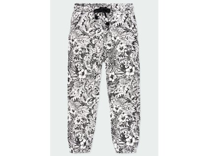 Sněhově bílé dívčí kalhoty s volánky a s designovým vzorem (větvičky, vylisovaný bublinkový efekt) ze španělské návrhářské dílny Villalobos + Nieves Alvarez. Pevný, neprůsvitný materiál.