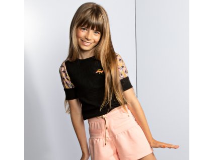 Elegantní dívčí šortky se širokými nohavicemi (sukně), s pružným pasem na stahování dekorovanou tkaničkou a lehce nabírané nohavice z pružného materiálu světle růžové broskvové barvy a silnější gramáže od holandské značky NoNo.
