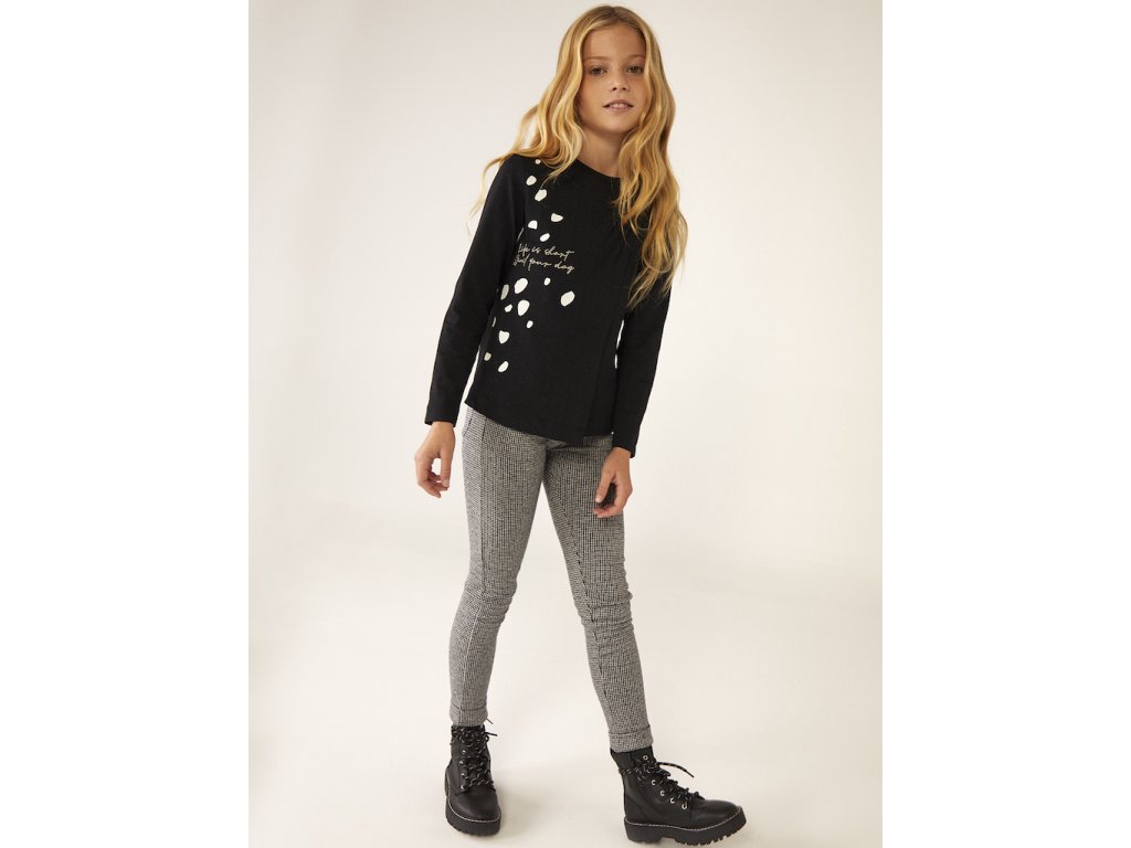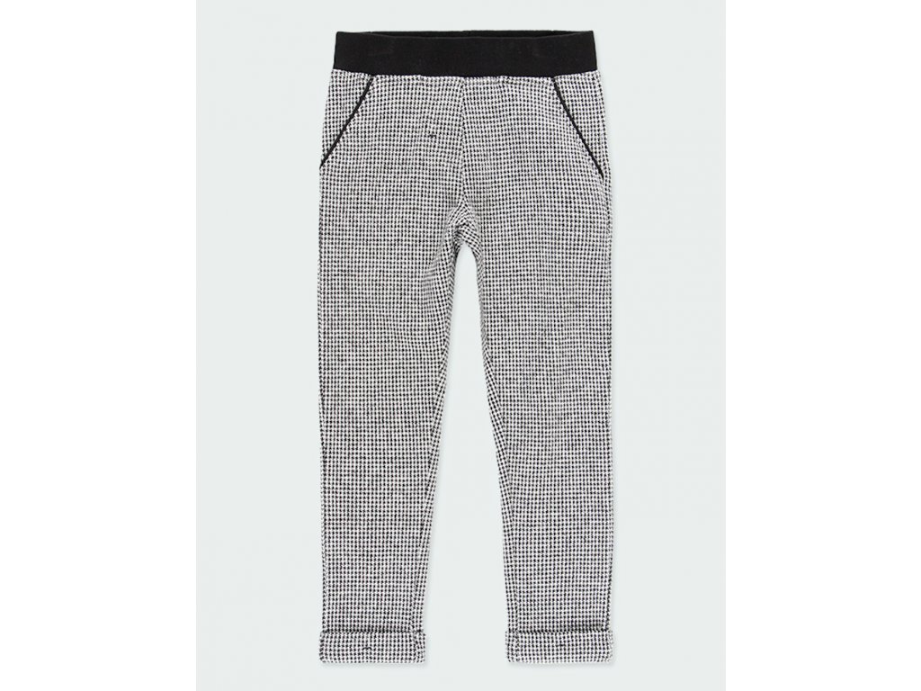 Pletené kalhoty přiléhavého střihu s drobným křížkovým černobílým vzorkem. V pase na širokou gumu, s kapsami a ohrnutými nohavicemi. Tyto strečové kalhoty pro holku jsou velmi pružné a příjemné pro celodenní nošení.