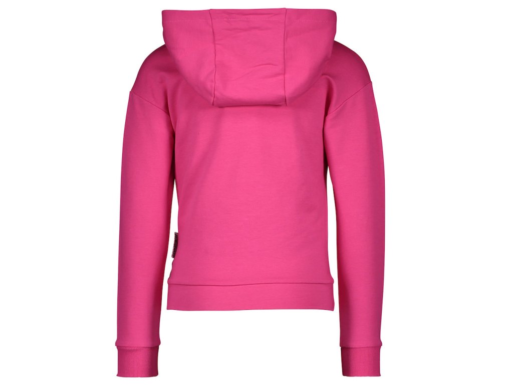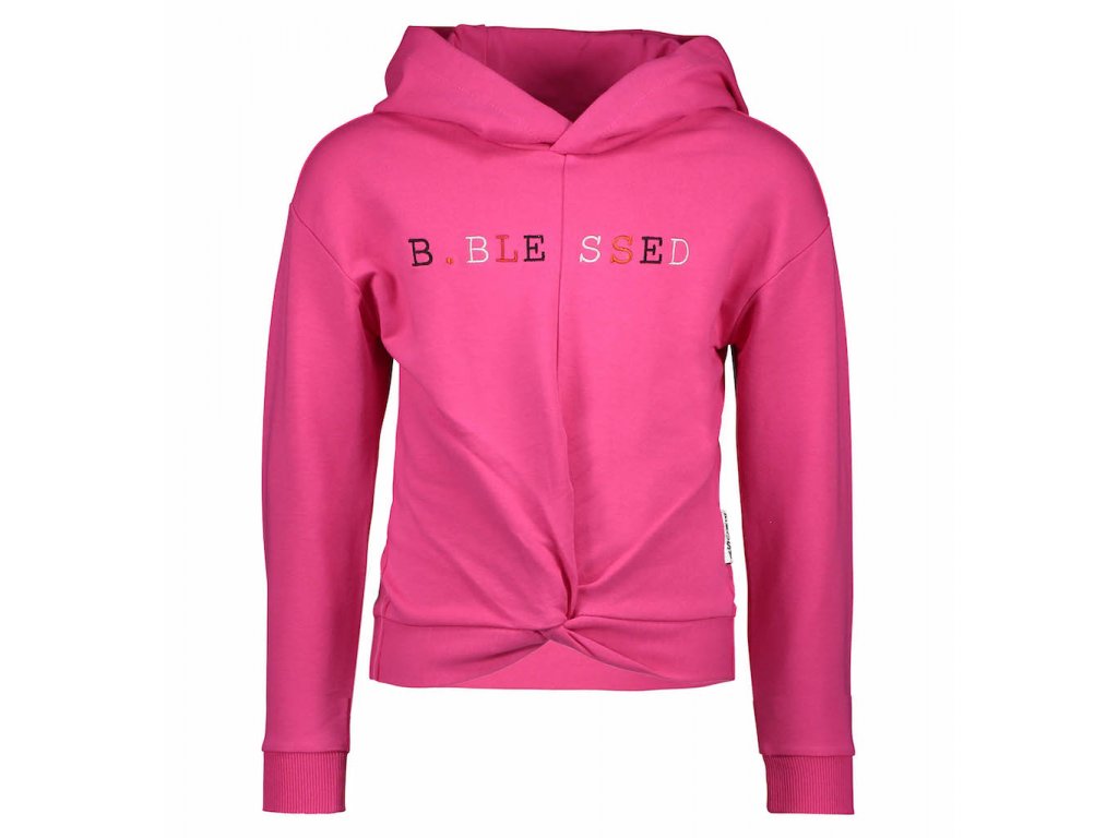 Krátká mikina s kapucí, uzlovým efektem a nášivkou na prsou ve fuchsiově růžové barvě. Příjemná pružná bavlna. Mikina do pasu pro holky od Holandské značky B-Nosy.