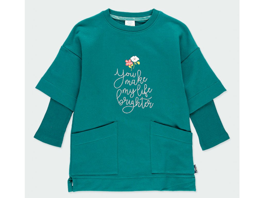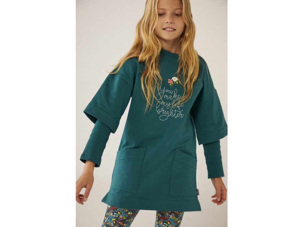 Tmavě zelené dívčí šaty s dlouhým rukávem či prodloužená mikina s velkými kapsami a zdvojeným rukávem (krátký přes dlouhý rukáv) s lurexovou výšivkou s pozitivním vzkazem. Velmi příjemná a pružná bavlna pro celodenní nošení