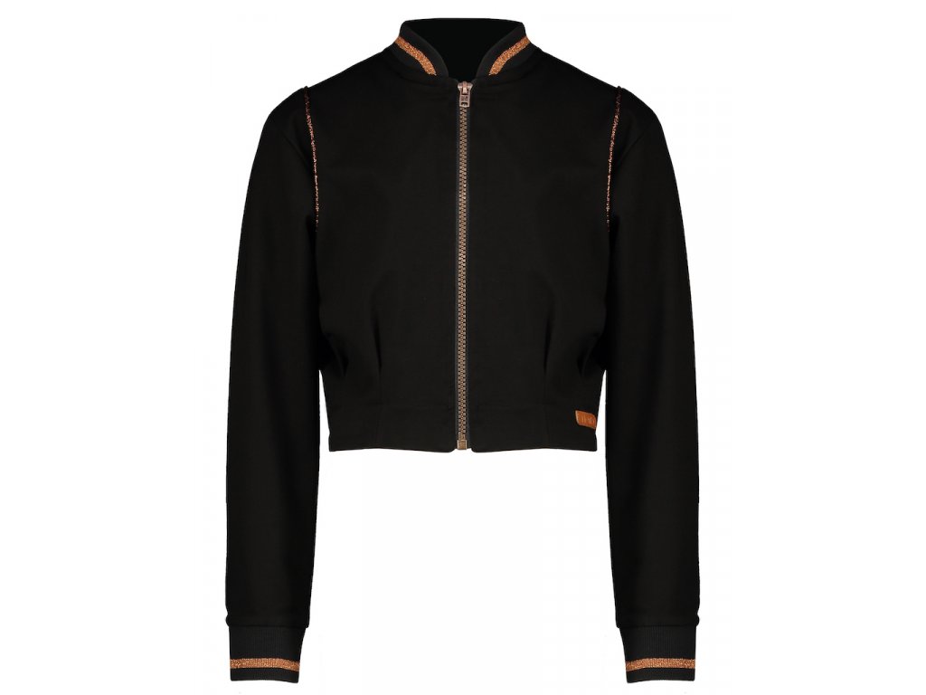 Černá mikina do pasu a na zip, ve stylu kabátku (indoor zip cardigan bomber), z velmi hladké a příjemné pružné viskózy, doplněná měděnou lurexovou nití. Holandský design pro holky a XS matky.