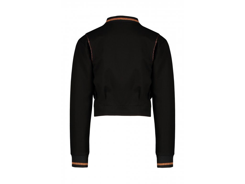 Černá mikina do pasu a na zip, ve stylu kabátku (indoor zip cardigan bomber), z velmi hladké a příjemné pružné viskózy, doplněná měděnou lurexovou nití. Holandský design pro holky a XS matky.