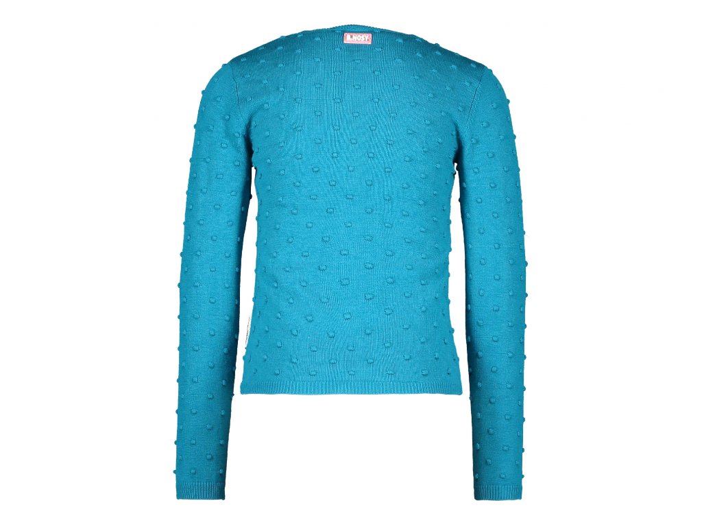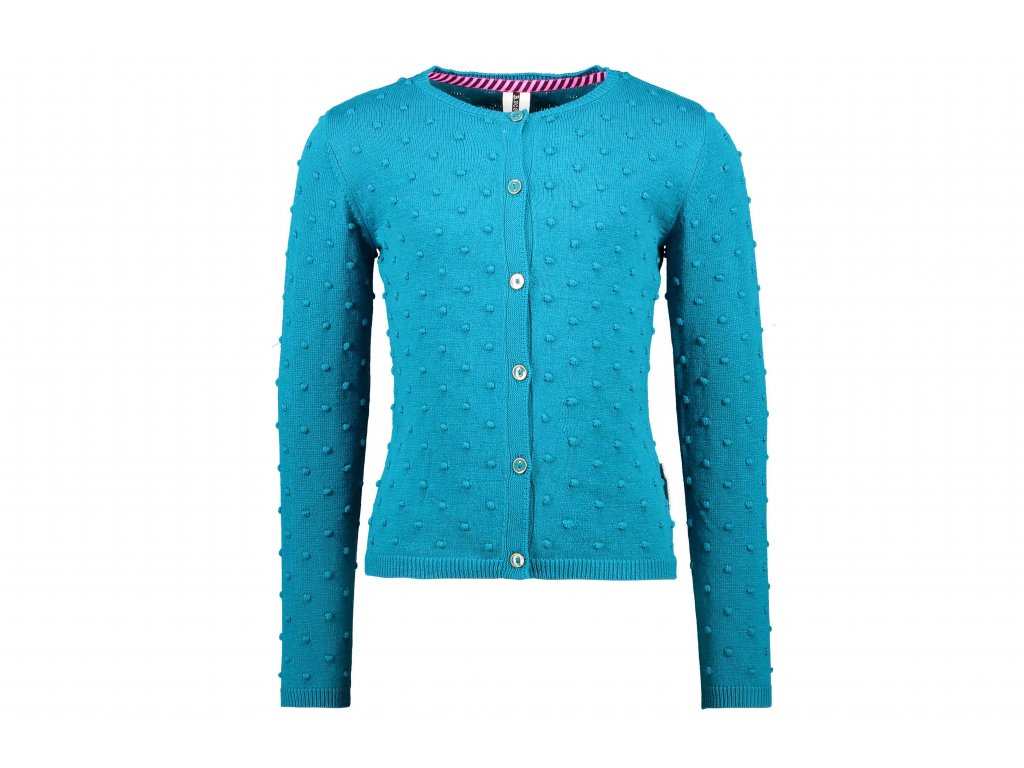 Lehký dívčí svetřík z jemného žakarového úpletu tmavě tyrkyové barvy, s puff refliéfem. Celopropínací svert na vkusné knoflíčky od Holandské značky pro dívky BNOSY.
