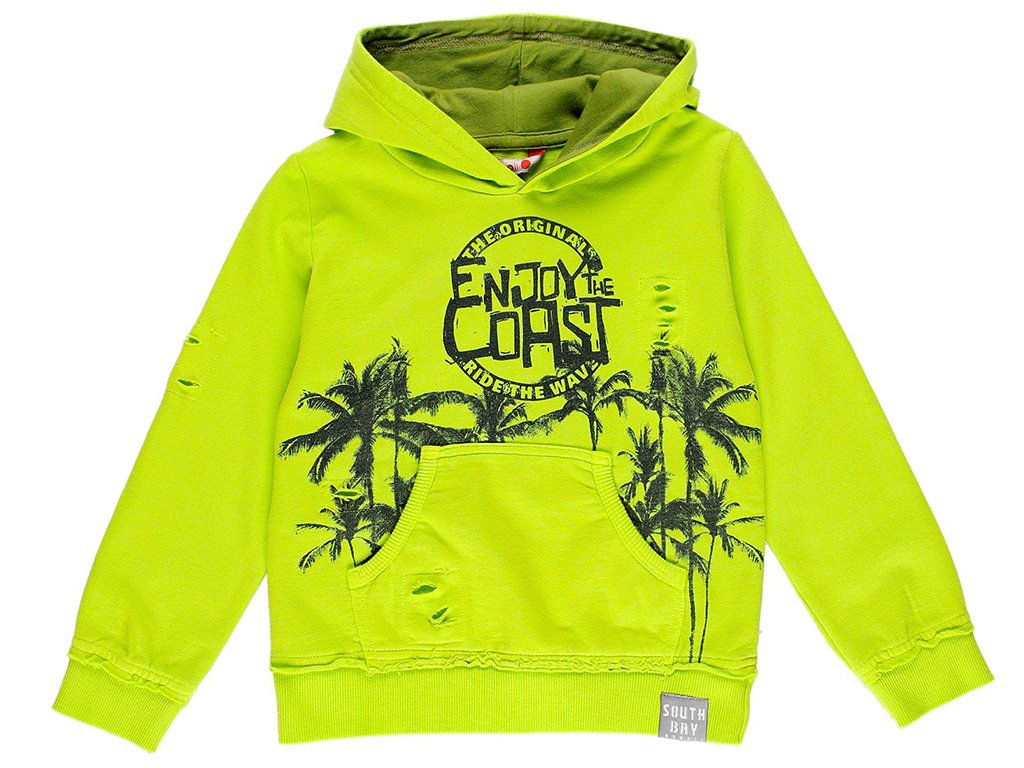 Dětské tričko s dlouhým rukávem nebo tenoučká mikina s kapucí a klokaní kapsou ze 100% bavlny v limetkově zelené barvě. V loktech zdobená falešnými záplatami a spodní lem s rozparky. Potisk na pohodářské téma u moře. Cool style pro malé surfaře!