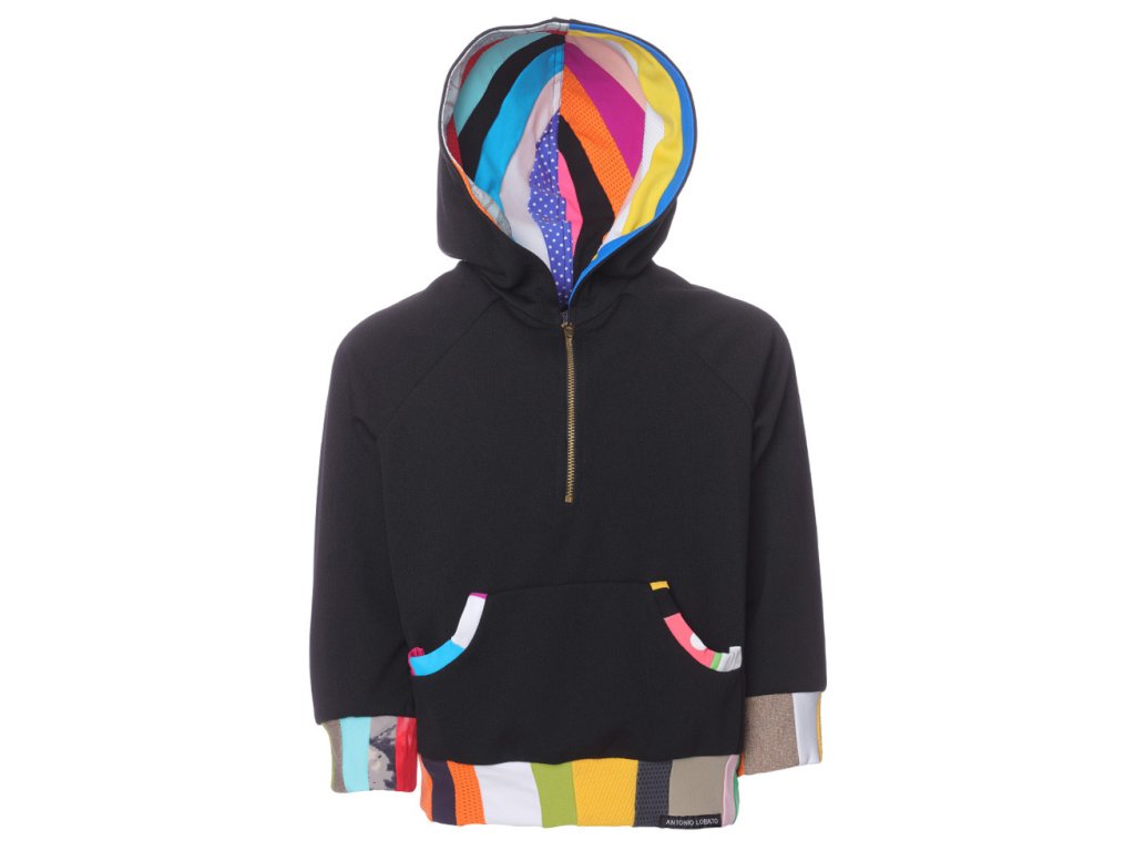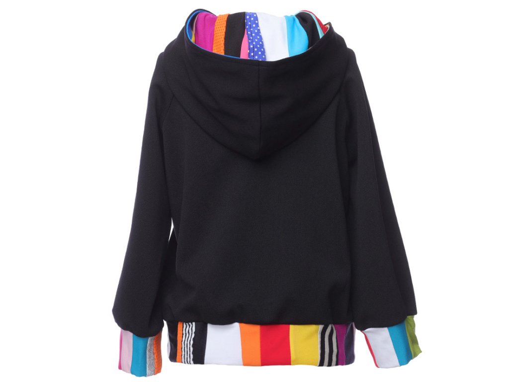 - Černá sportovní dětská mikina Pique je lemovaná drobným pestrobarevným patchworkem z kvalitních látek na rukávech, límci, vnitřku kapuce a s velkou centrální kapsou typu klokánek.