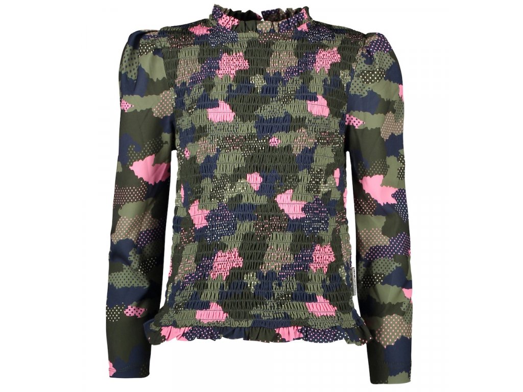 Halenka pro holku s žabkovým tělem, balónovým rukávem a především s maskáčovým vzorem s růžovou, zelenou, a tmavě modrou od Holandské značky B-Nosy.