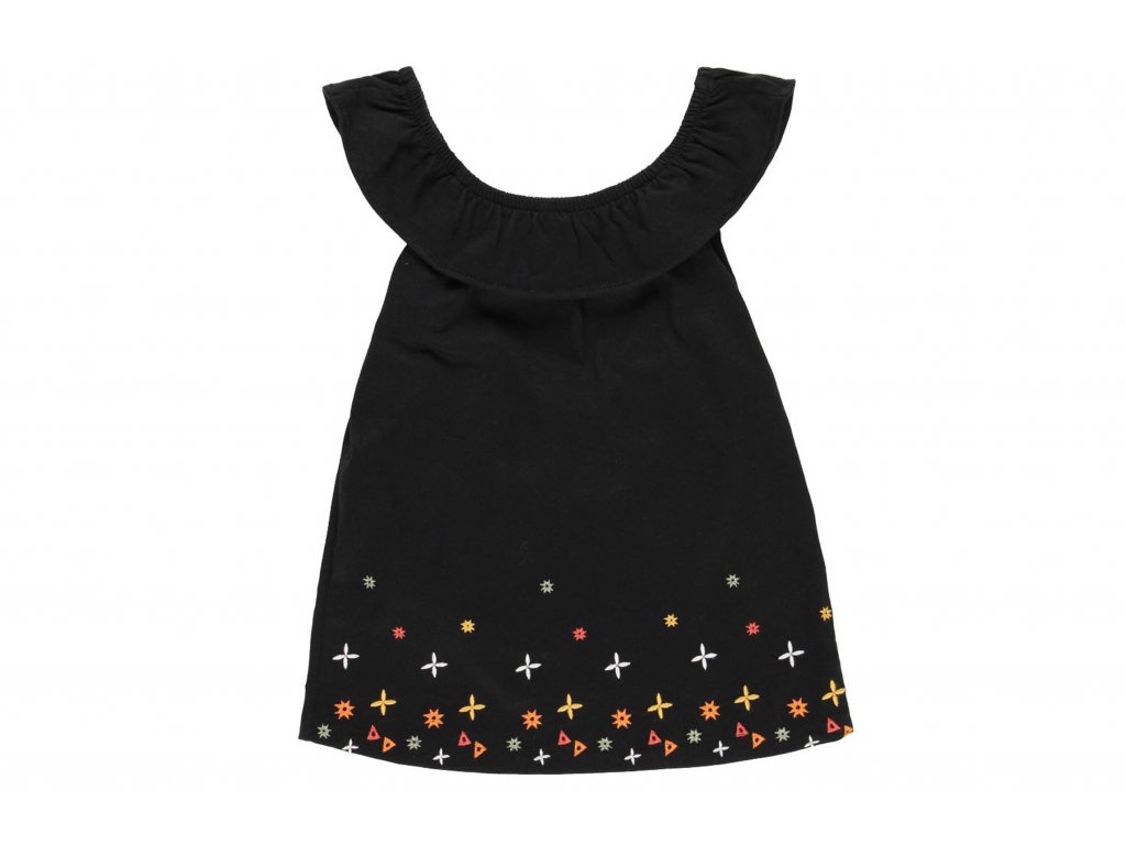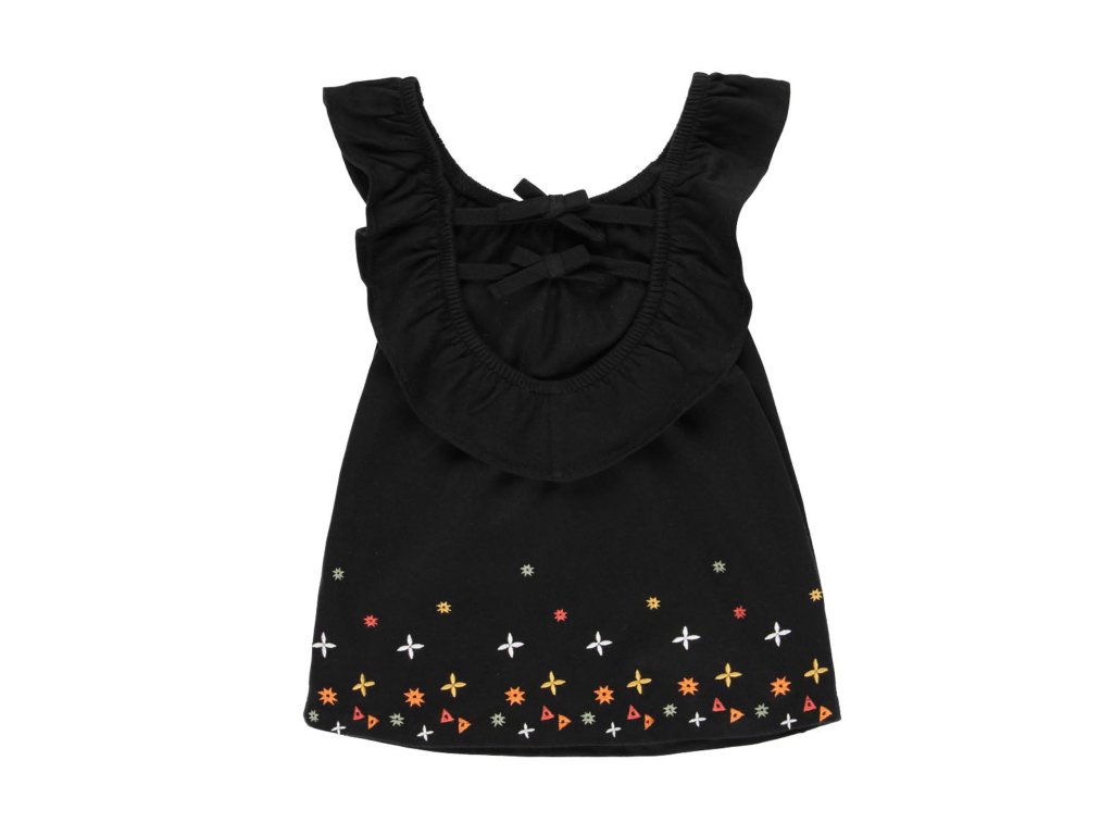 Černé tílko s něžným límečkovým volánkem, otevřenými zády a drobnými barevnými výšivkami. Velmi příjemná 100% bavlna. Kolekce Afrika od Boboli