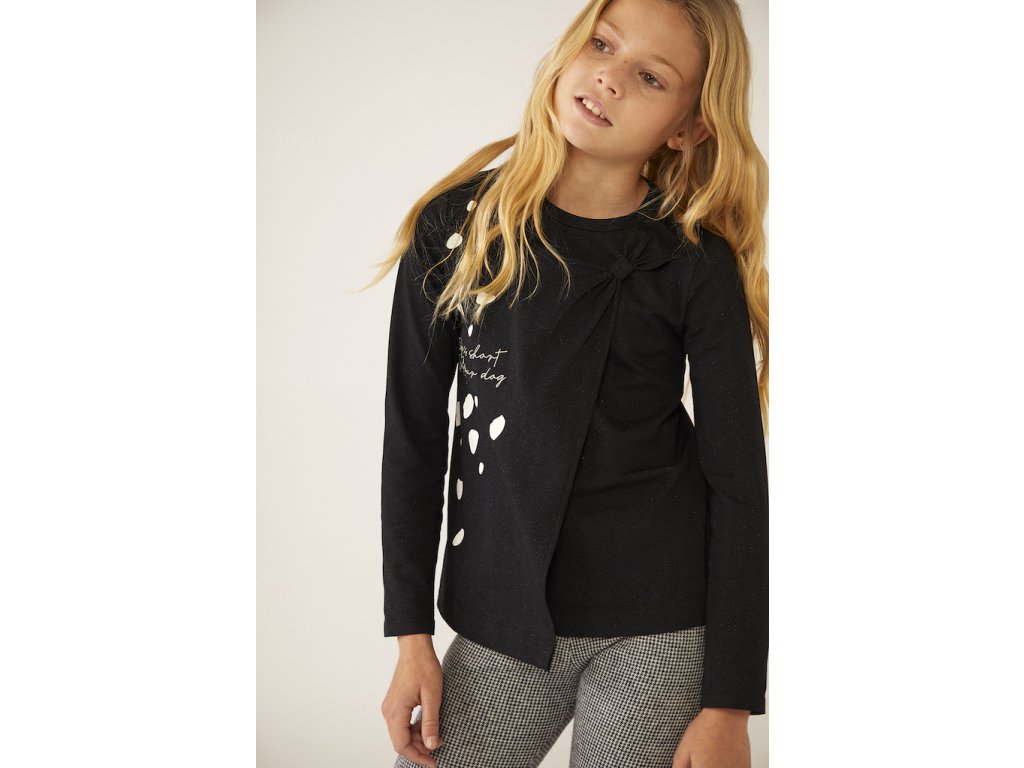 Tmavé dívčí tričko s dlouhým rukávem, zdvojeným předním dílem, volně otevřeným, a s mašlí. Pružná černá bavlna s jemnými třpytkami. Boboli holka kolekce Dalmatin pro milovnici pejsků.
