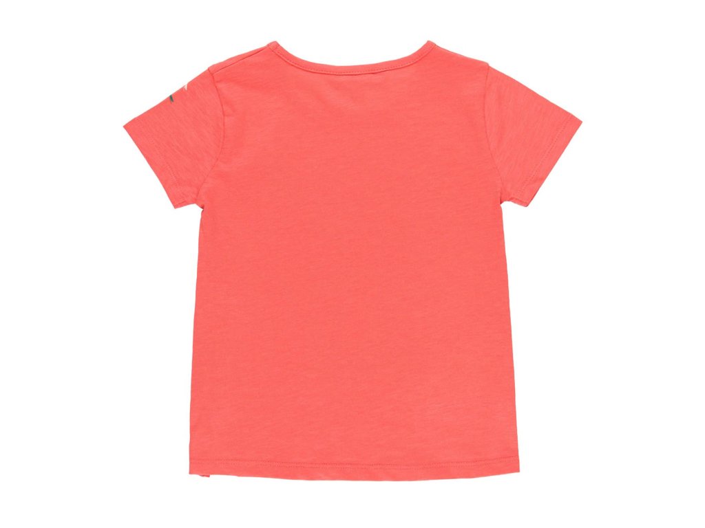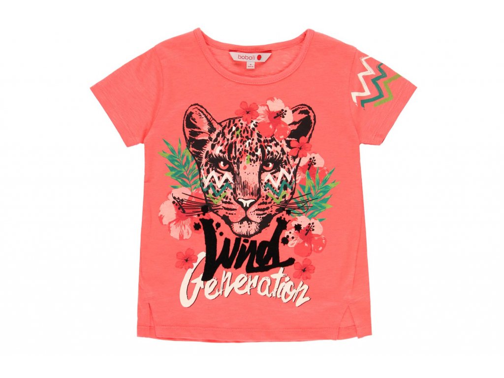 Korálově růžové tričko s rozparky a kombinovaným potiskem s plyšovým nápisem a gepardicí. Příjemná 100% bavlna s jemným melírem. Růžová tón-v-tónu. Kolekce Tropical od Boboli