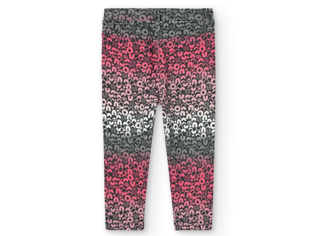 Růžové dívčí kalhoty ve stylu džínů (džegíny), zateplené jemným fleecem a se širokým pružným pasem a zajímavým potiskem s šedými a bílými tóny. Španělská značka.