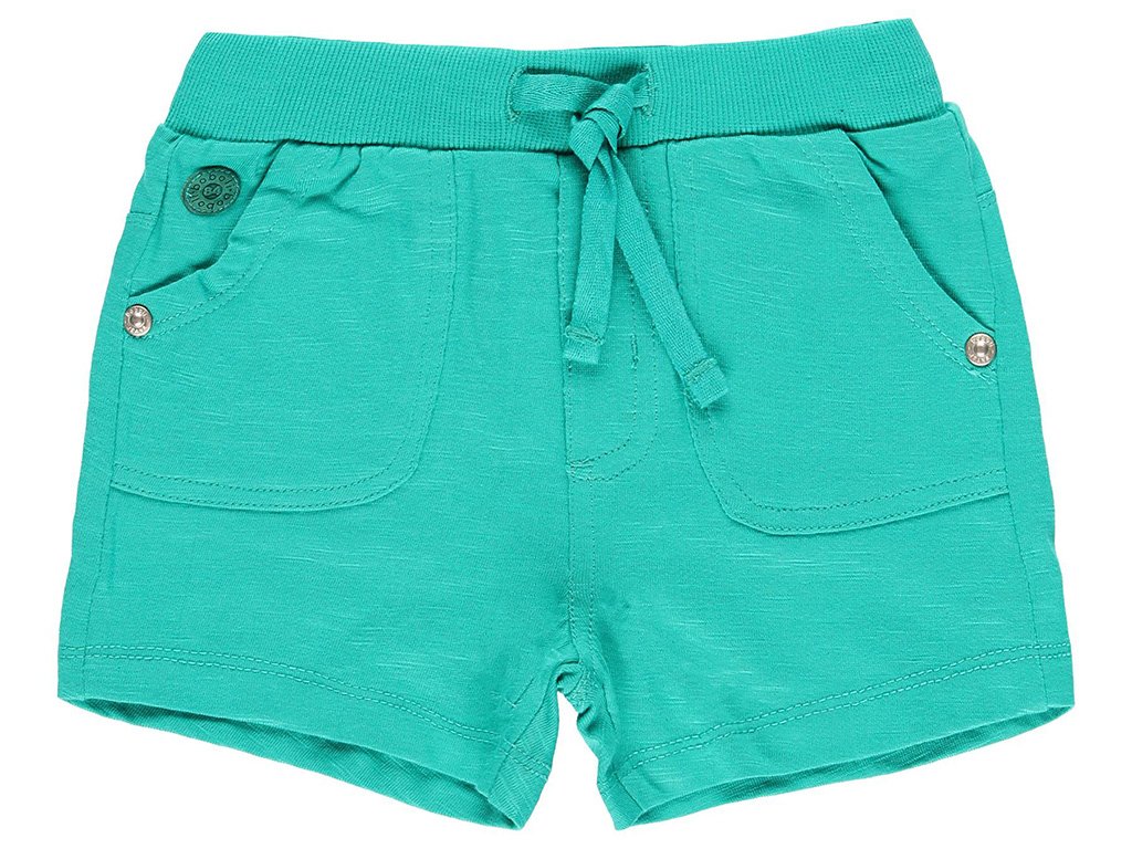 Dětské kraťasy ze 100% bavlny ve svěží tyrkysově zelené barvě, pasem na gumu se stahováním, dvě přední kapsy a zadní sedlový klín. Velmi příjemné a pružné.