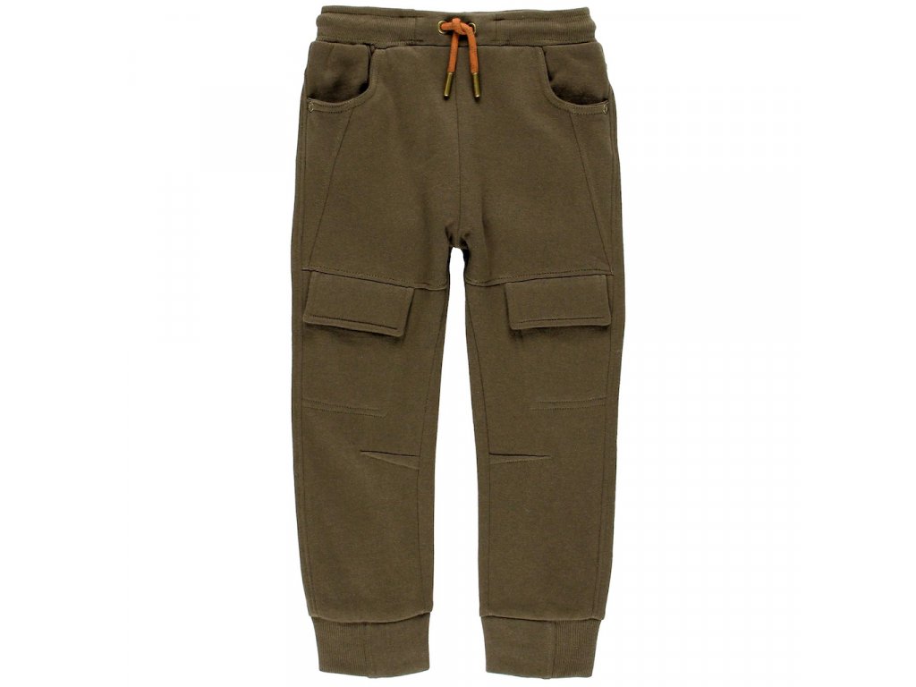 Bavlněné khaki teplákové kalhoty pro kluka, styl kapsáče, se dvěma klasickými a dvěma obálkovými kapsami. Tepláky s jemným fleecem. V pase s pružným nápletem a tkaničkou na zavazování. Klínový střih v kolenou.