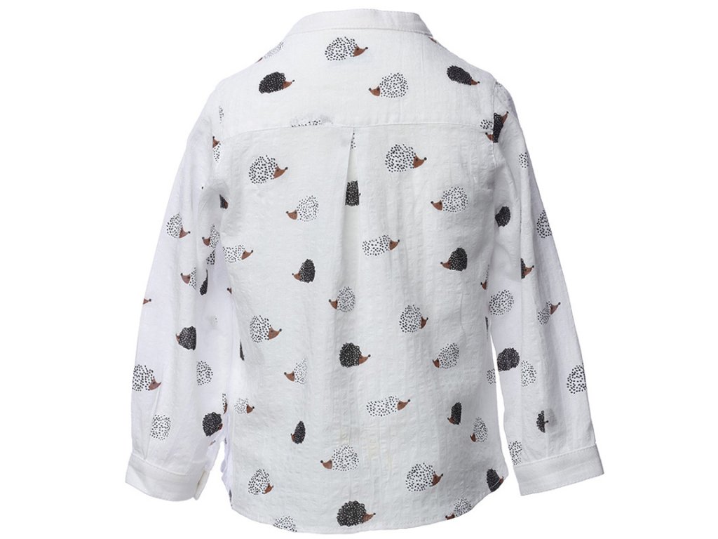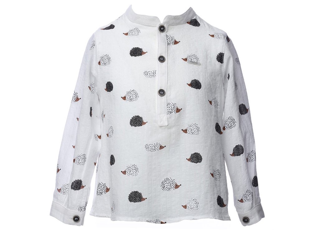 Bílá dětská košile s potiskem ježečka z měkké mačkané bavlnky, s nabíráním v zádech a zapínáním u krku na tři zdobné knoflíčky od Španělské značky Foque. Unisex.