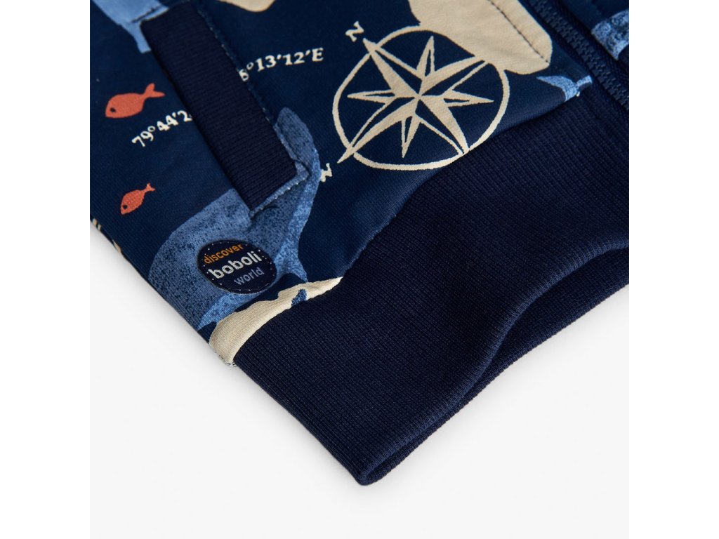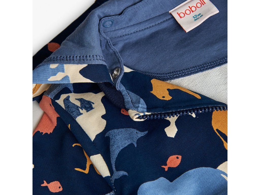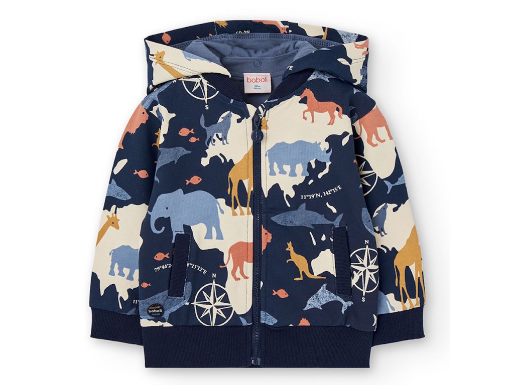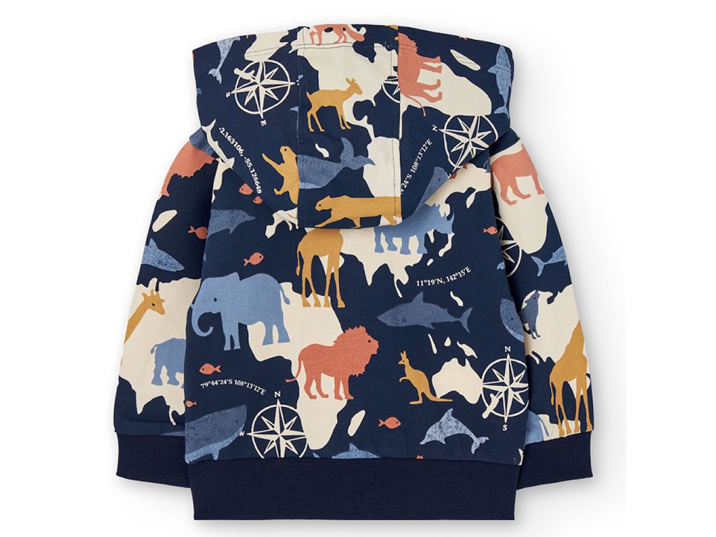 Modrá mikina na zip s odepínací kapucí pro kluka. Pružná 100% bavlna s potiskem zvířat z celého světa. Kolekce Boboli podzim/zima, Španělsko.