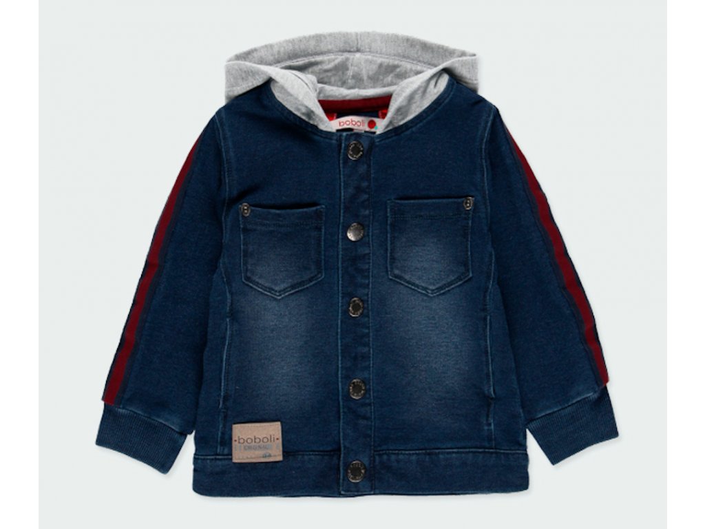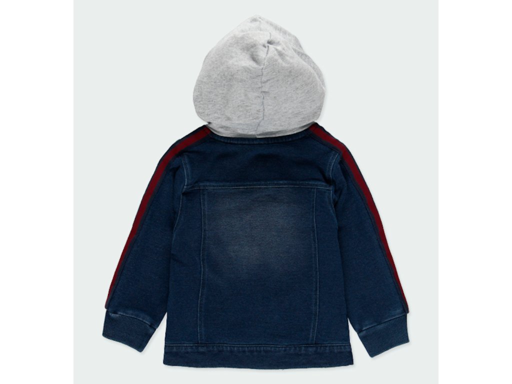 Měkounká verze džínové bundičky s kapucí, rozepínáním na patentky a čtyřmi kapsami. Pružná bavlna v tmavě modrém denimu se světle šedou kapucí pro malého fešáka.