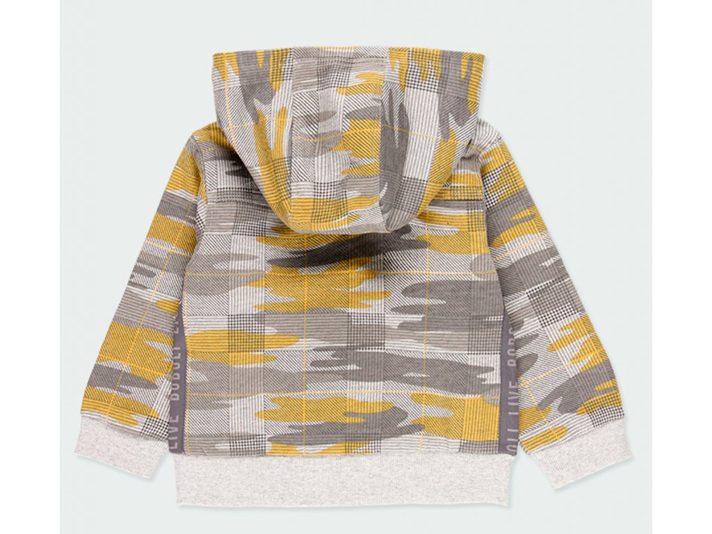 Chlapecká mikina na zip a s odepínací kapucí s moderním vzorem světle šedé a hořčičně žluté barvy. OEKO-TEX certifikát. Amfori udržitelná móda od Boboli.