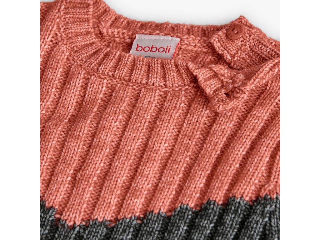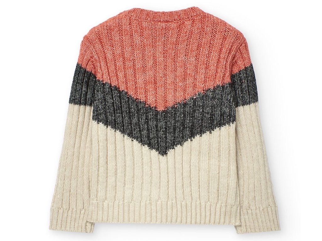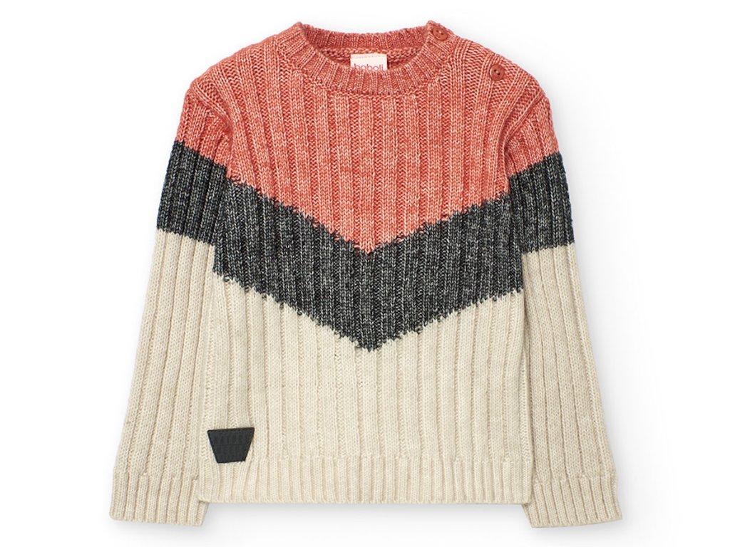 Žebrovaný svetr pro kluka v přírodních barvách jílově oranžové, antracitově šedé a sražené bílé. Velmi příjemná, pružná a měkounká pletenina. Španělsko, kolekce od Boboli.