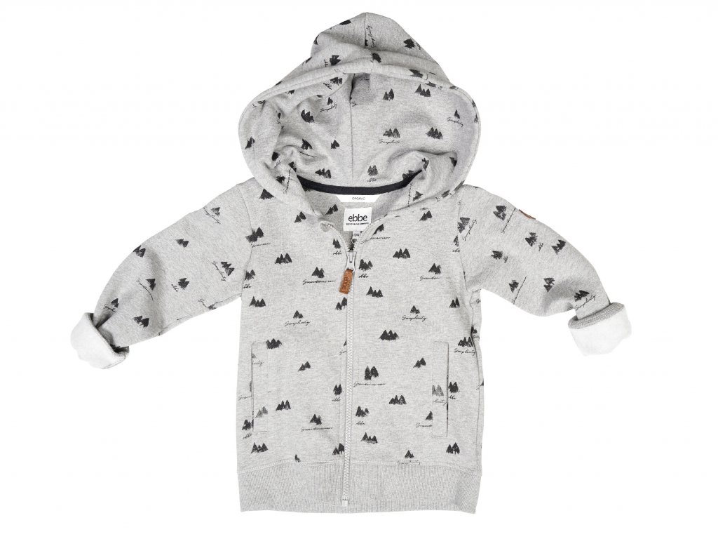 Dětská mikina na zip a s kapucí od Švédské značky EBBE. Šedá bio bavlna s recyklovaným polyesterem s jemným potiskem hor. Skandinávský minimalizmus.