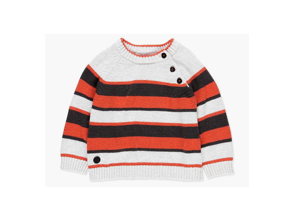 Svetr z jemného pružného úpletu, hebounký na dotek, v kombinaci barevných pruhů antracitově šedé, cihlově červené a světle šedé. Atypické zapínání u krku na 3 knoflíky.