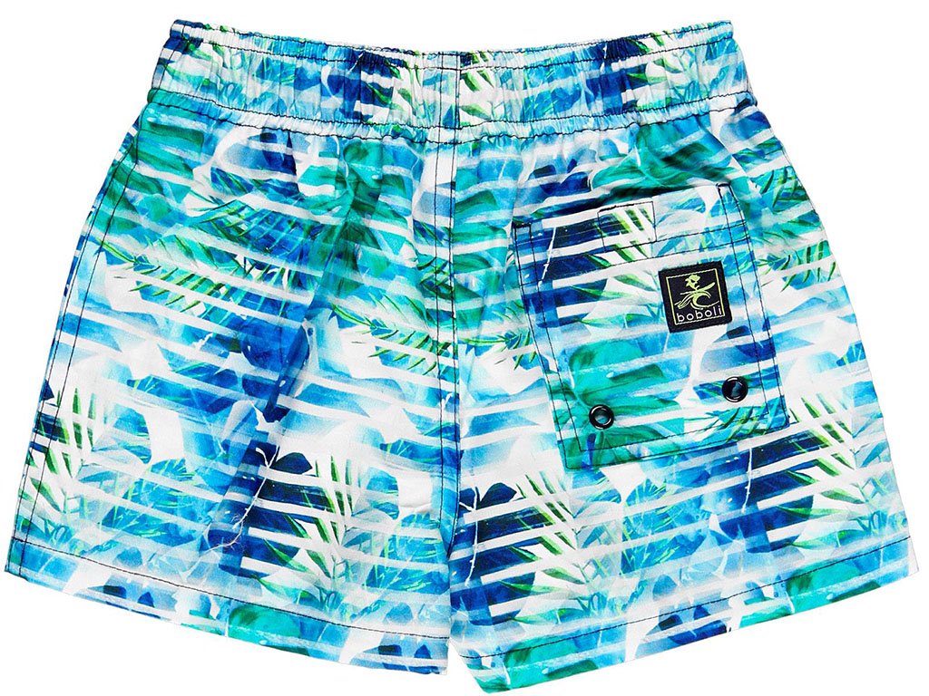 Zajímavé koupací kraťasy pro kluka s vrstveným potiskem různodruhových kreseb tropických listů v kombinaci modré a zelené na bílém podkladě, přerušované stínovanými proužky. Bez obav pro malé i velké aktivní kluky. S volnou podšívkou ve tvaru slipů z jemné síťoviny. V pase na širokou gumu se stahováním na černou tkaničku. Vzadu jedna kapsa se zapínáním na suchý zip a surf logo.