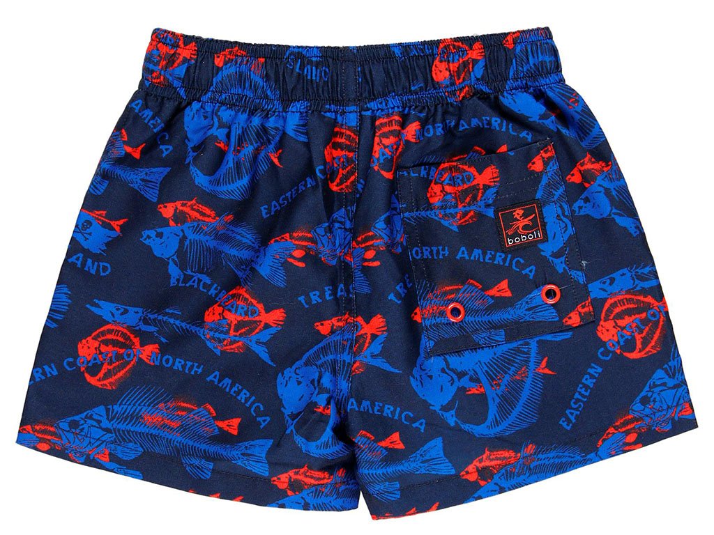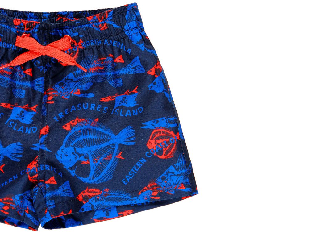 Tmavě modré koupací kraťasy pro kluka s potiskem různých druhů rybích koster a pirátské vlajky (treasure island) v zajímavém kontrastu zářivě červené barvy. Bez obav pro malé i velké kluky. S volnou podšívkou ve tvaru slipů z jemné síťoviny. V pase na širokou gumu se stahováním na tkaničku. Vzadu jedna kapsa se zapínáním na suchý zip.