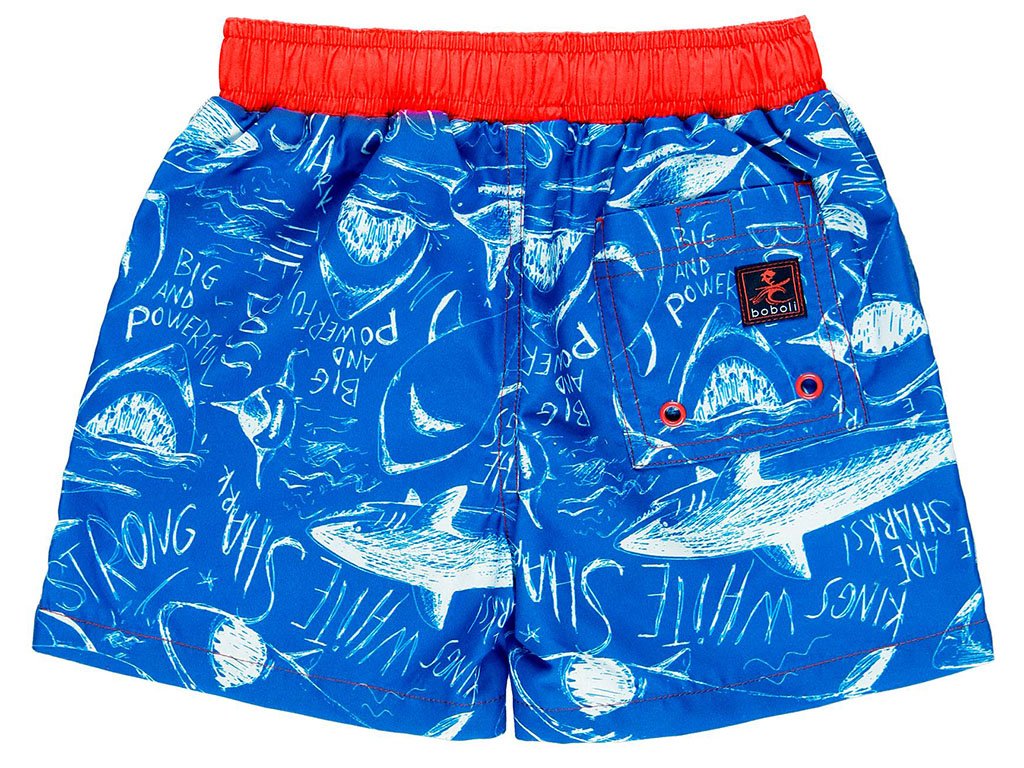 Modré koupací kraťasy pro kluka s potiskem různých kreseb bílého žraloka v zajímavé kompilaci se zabudovanými nápisy (big and powerful, white shark, the king sea). S volnou podšívkou ve tvaru slipů z jemné bílé síťoviny, také s potiskem žraloka. V pase na širokou gumu se stahováním na tkaničku v červené barvě. Vzadu jedna kapsa se zapínáním na suchý zip a surf logo.