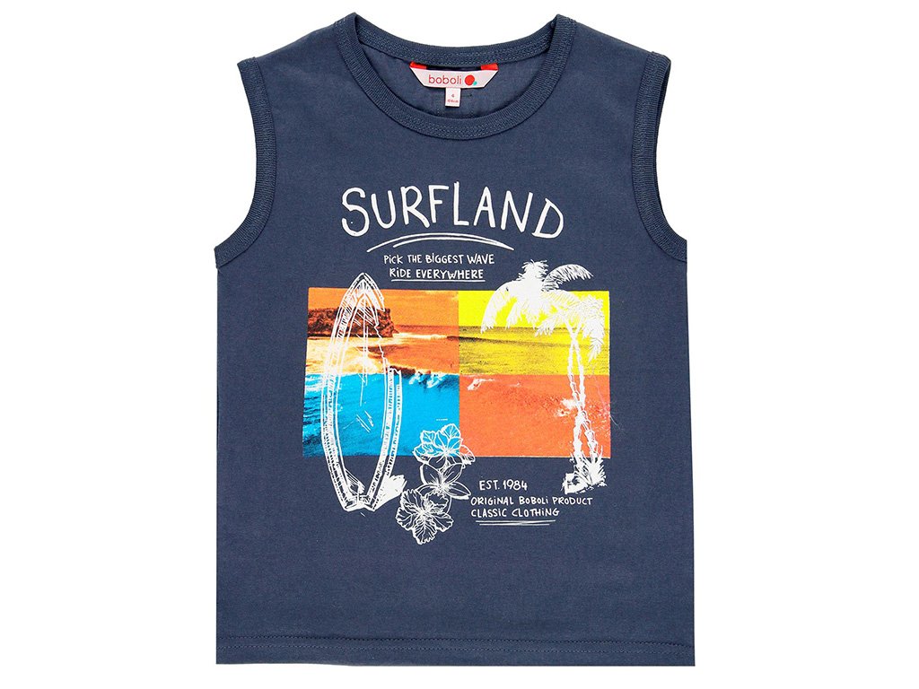 Chlapecké tílko z jemné, lehce pružné 100% bavlny tmavě modré barvy (navy) s barevným potiskem na téma surfing (surf, moře). Letní tričko pro chlapce.