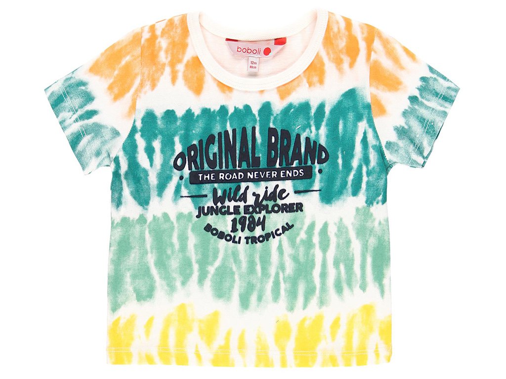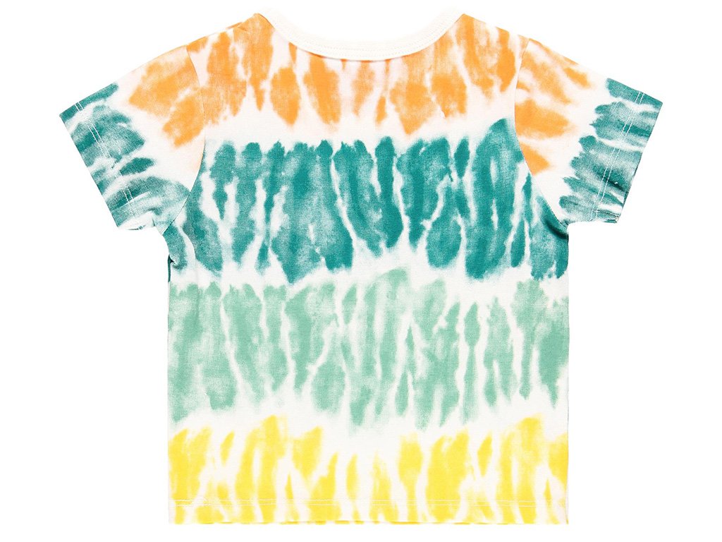 Dětské bílé tričko ze 100% bavlny s černým 3D plyšovým potiskem (plush) a trojbarevnou oboustrannou batikou (oranžová, zelená, žlutá). Kolekce Surf.