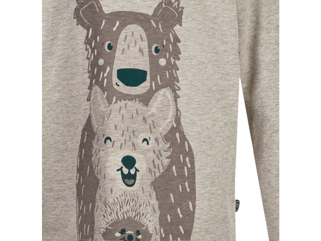 Tričko s dlouhým rukávem pro kluka s veselým 3D potiskem lesních zvířátek od Dánské značky. Příjemná pružící bavlna v béžovém melíru s khaki.