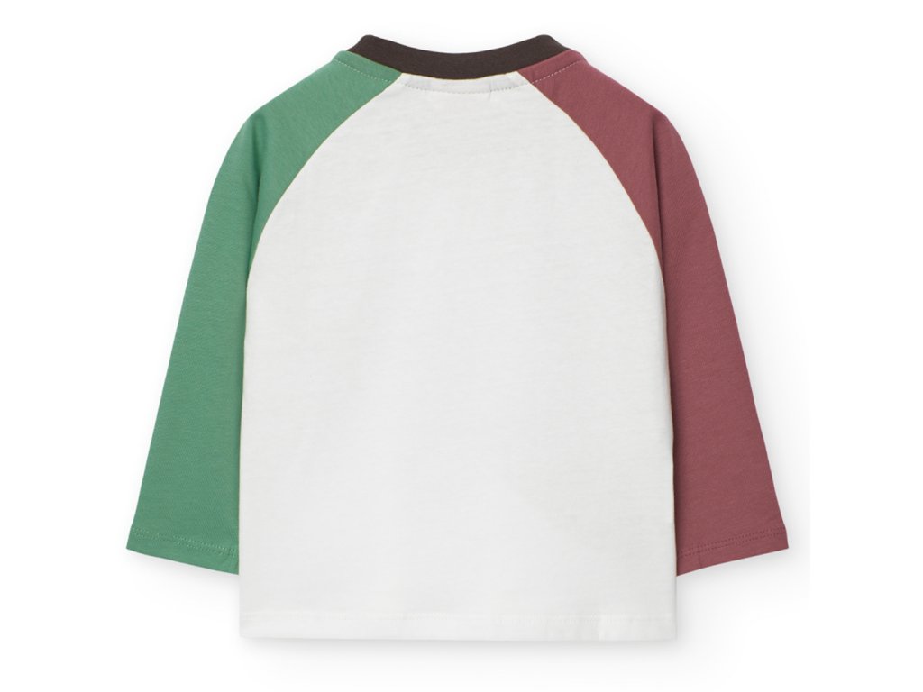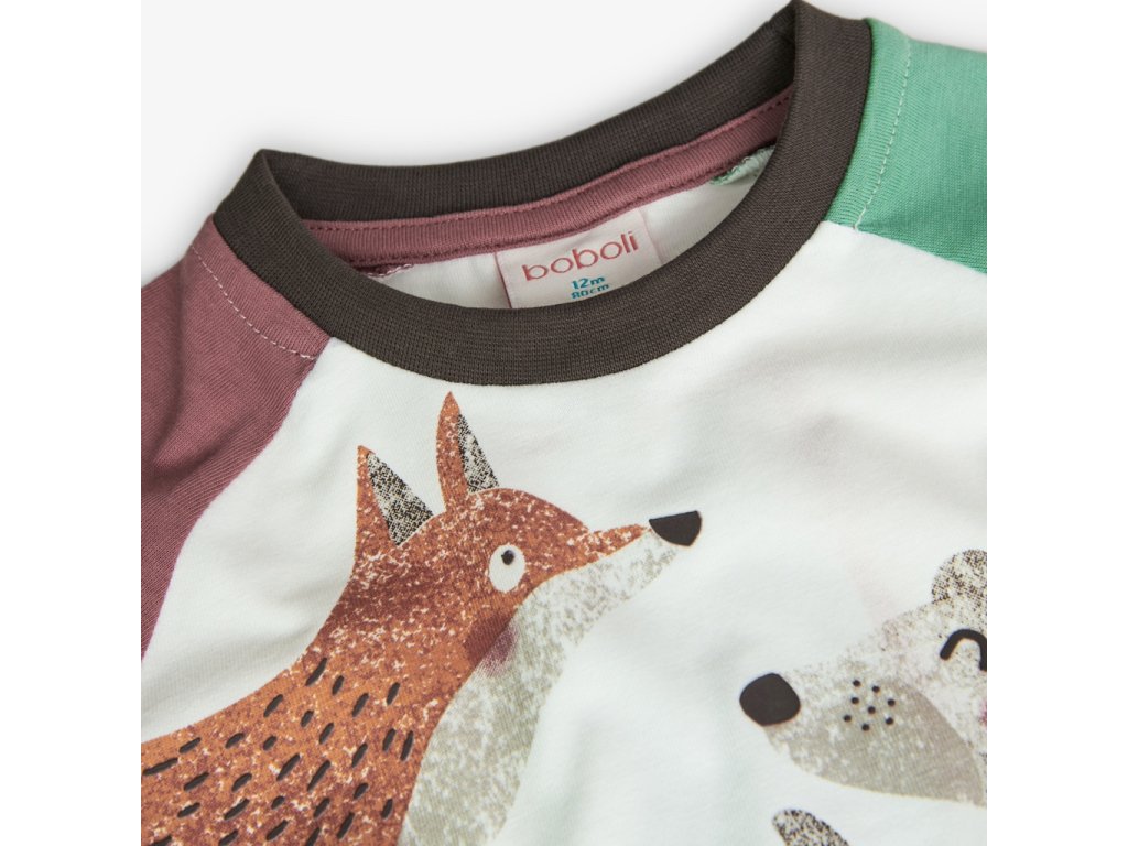 Veselé tričko s dlouhým rukávem pro kluka je z jemné 100% bavlny bílé barvy a s barevnými rukávy, střih raglan. Chlapecké tričko je pružné a příjemné, s barevným potiskem lesních zvířátek.